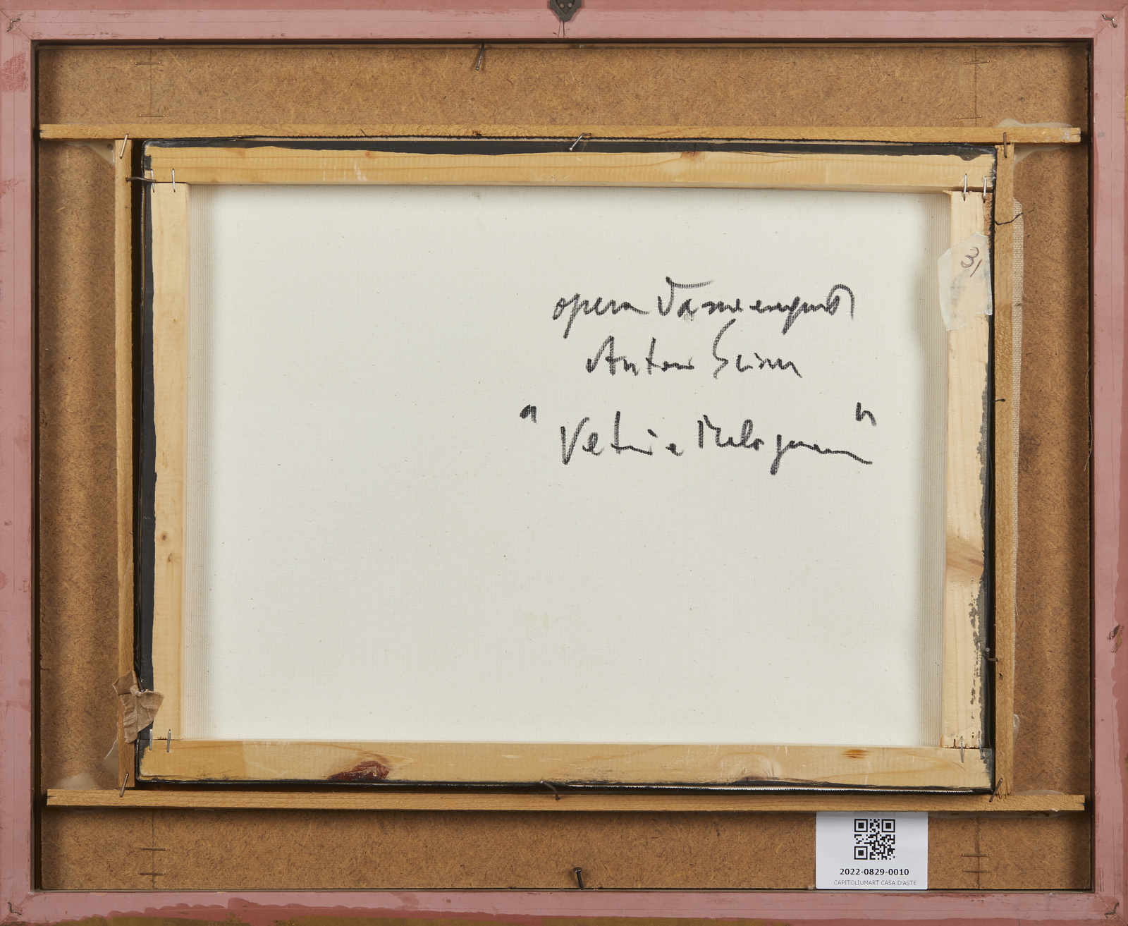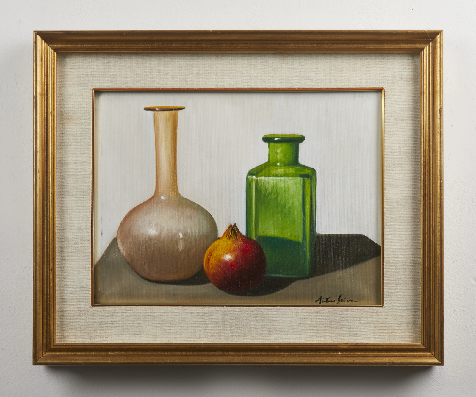 SCIACCA ANTONIO (n. 1957) Vetri e melograno. . Olio su tela . Cm 40,00 x 30,00. Firma in basso a destra. Al retro firma e titolo. Autentica dell'artista su fotografia. . Cornice presente