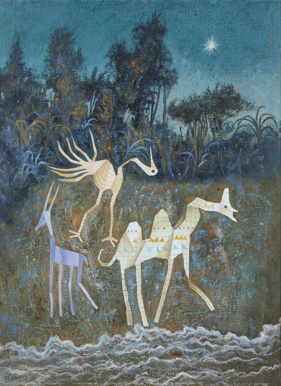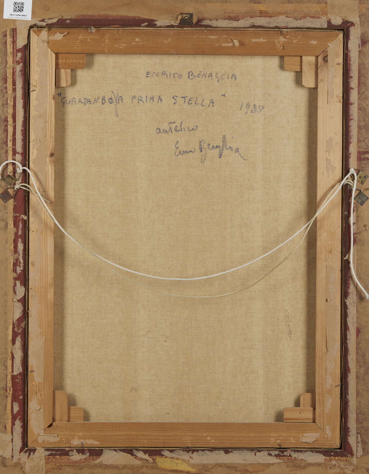 BENAGLIA ENRICO (n. 1938) Guardando la prima stella. 1988. Tecnica mista su tela. Cm 60,00 x 80,00. Firma in basso a sinistra. Al retro titolo, firma e anno. Autentica dell'artista su fotografia. Lievi difetti. Cornice presente