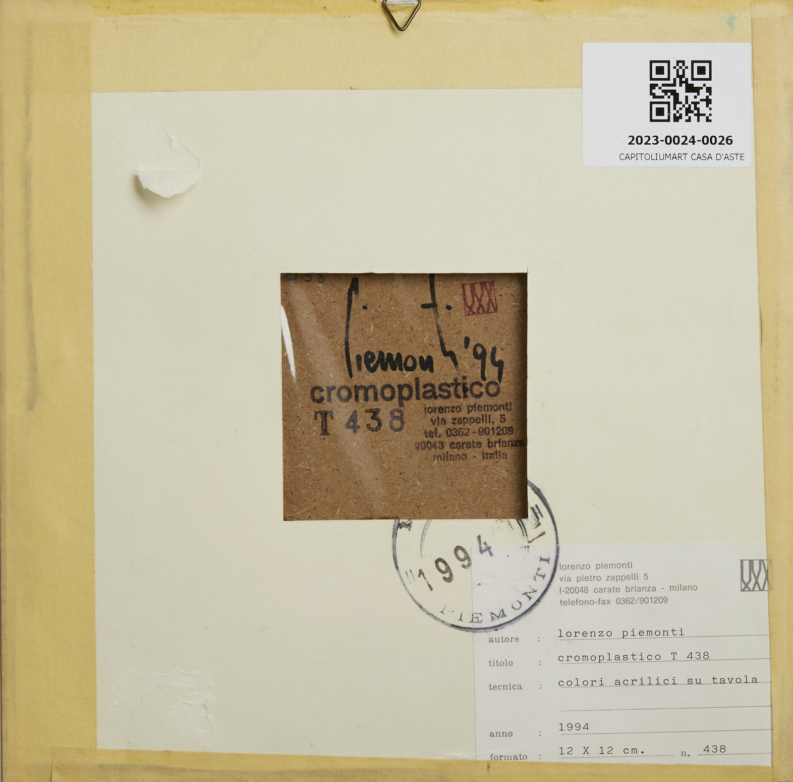 PIEMONTI LORENZO (n. 1935) Cromoplastico T 438. 1994. Acrilico su tavola. Cm 12,00 x 12,00. Al retro firma, titolo, anno e cartiglio descrittivo Lorenzo Piemonti, Milano. . Cornice presente