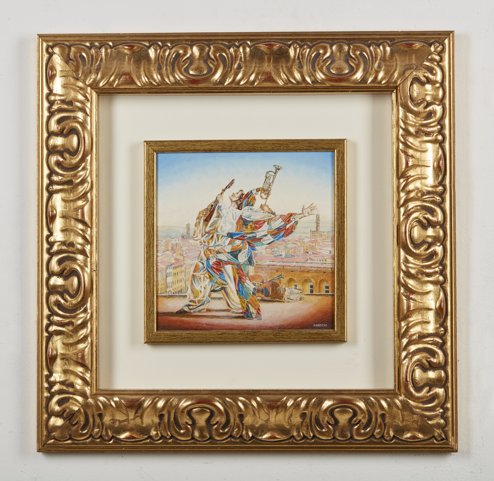 NARDONI SERGIO (n. 1947) Firenzina con musica. Tecnica mista su cartone. Cm 19,00 x 19,00. Firma in basso a destra. Al retro titolo, firma e timbro archivio fotografico Nardoni. Autentica dell'artista su fotografia riportante il relativo numero d'inventario. . Cornice presente
