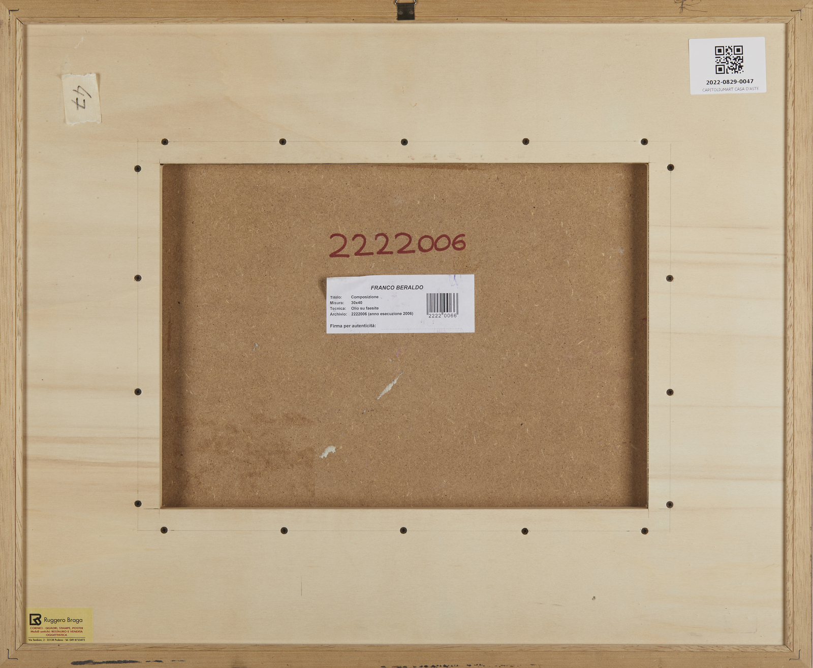BERALDO FRANCO (n. 1944) Composizione. . 2006. Olio su faesite. Cm 40,00 x 30,00. Firma in basso al centro. Cartiglio descrittivo al retro. Autentica dell'artista su fotografia. . Cornice presente