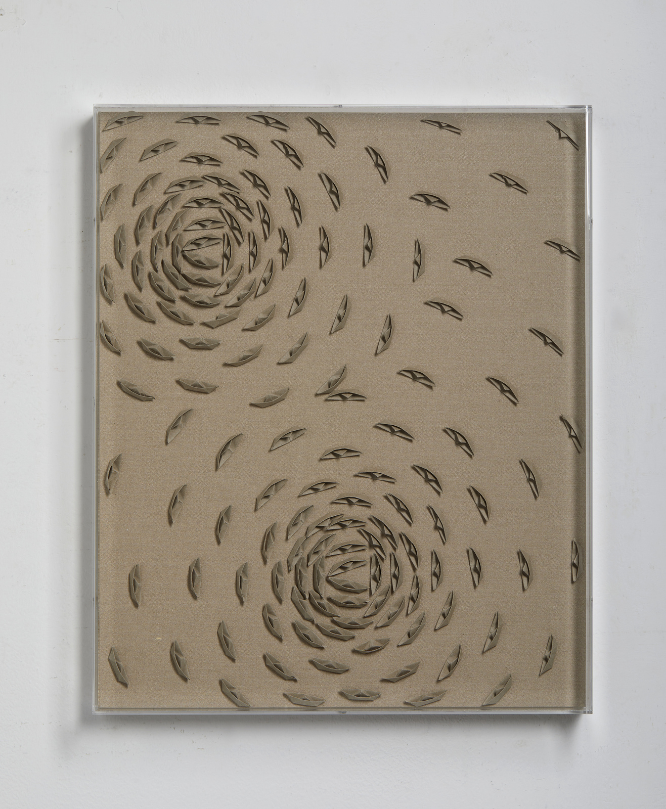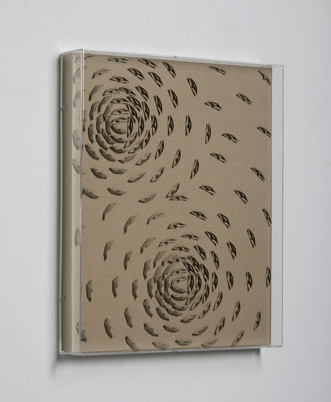 GUSMAROLI RICCARDO (n. 1963) Vortice ecru. 2022. Barche di carta su tela . Cm 45,00 x 55,00 x 7,50. Al retro firma. Autentica dell'artista su fotografia, riportante il relativo numero d'inventario. Entro teca di plexiglass.