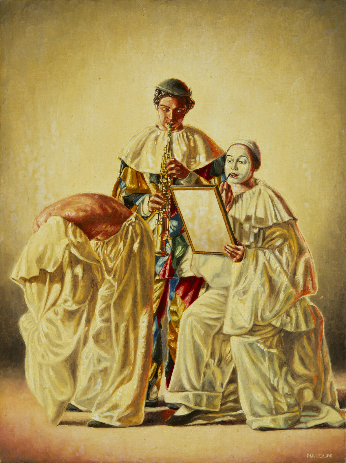 NARDONI SERGIO (n. 1947) Dietro le quinte. Olio su tela . Cm 30,00 x 40,00. Firma in basso a destra. Al retro titolo, firma e timbro Archivio fotografico Nardoni. Autentica dell'artista su fotografia riportante il relativo numero d'inventario. Cornice presente