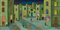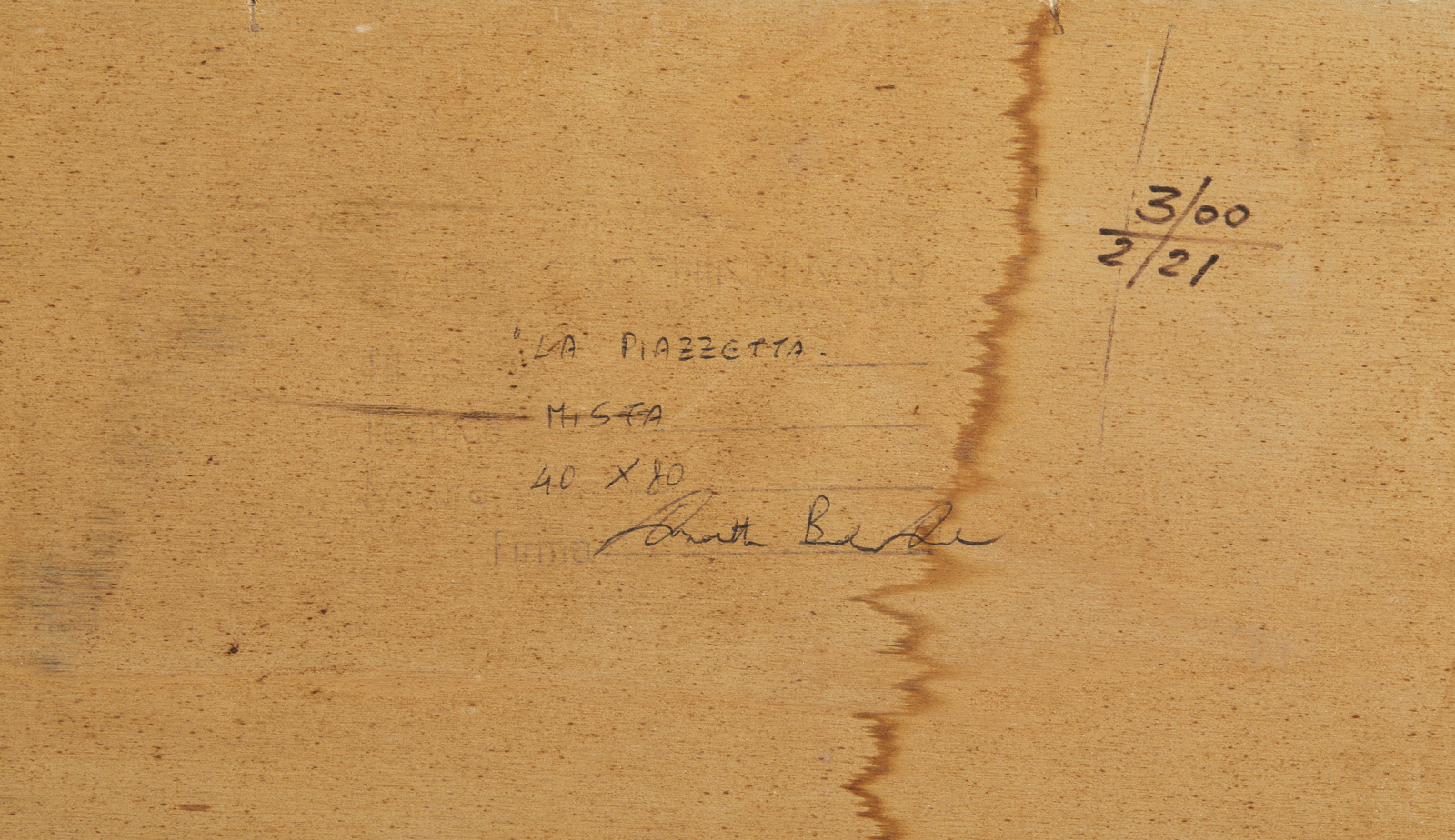 PROIETTI PAOLO (n. 1959) La piazzetta. Olio su tavola. Cm 80,00 x 40,00. Firma in basso a destra. Al retro titolo e firma.
