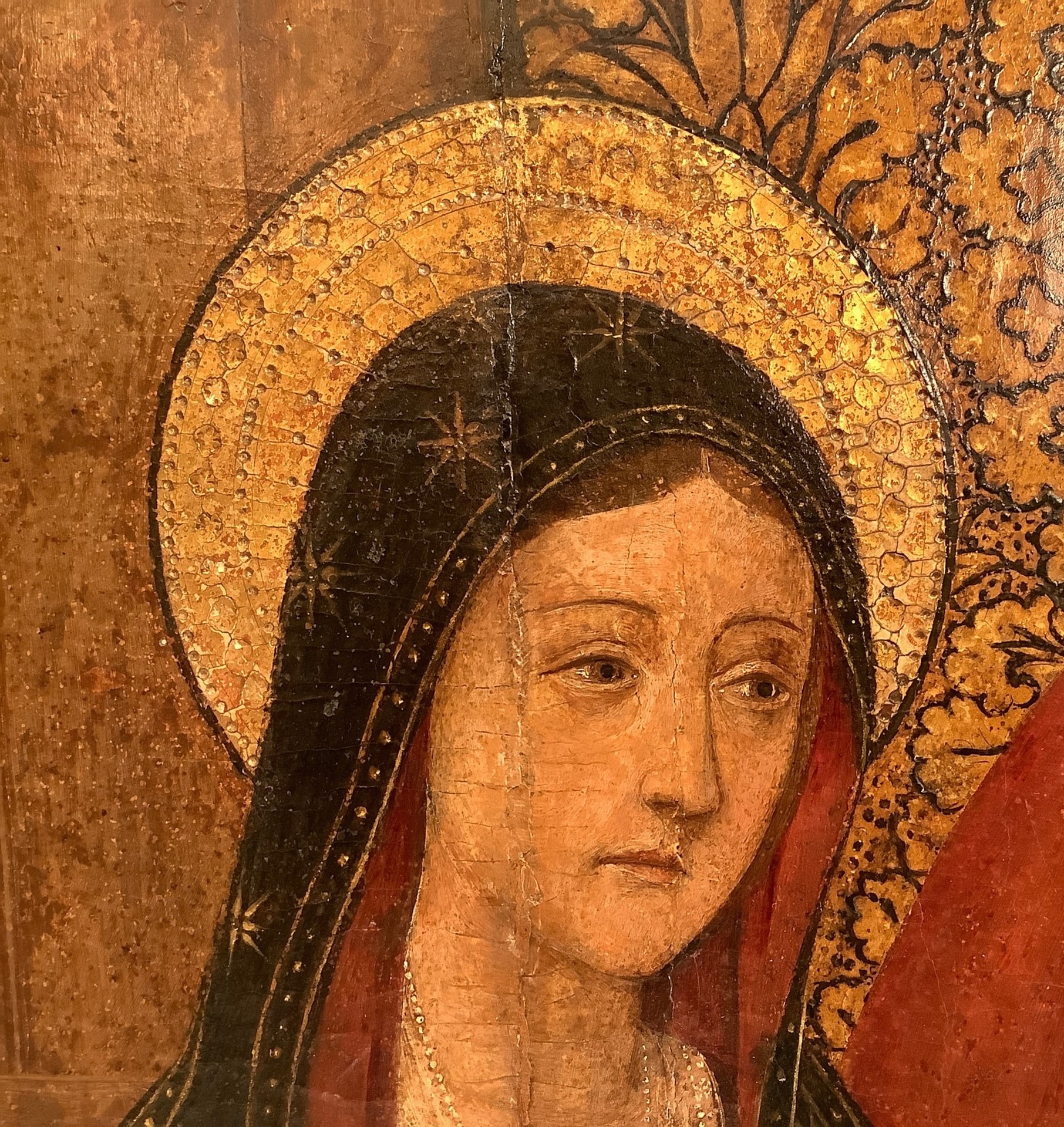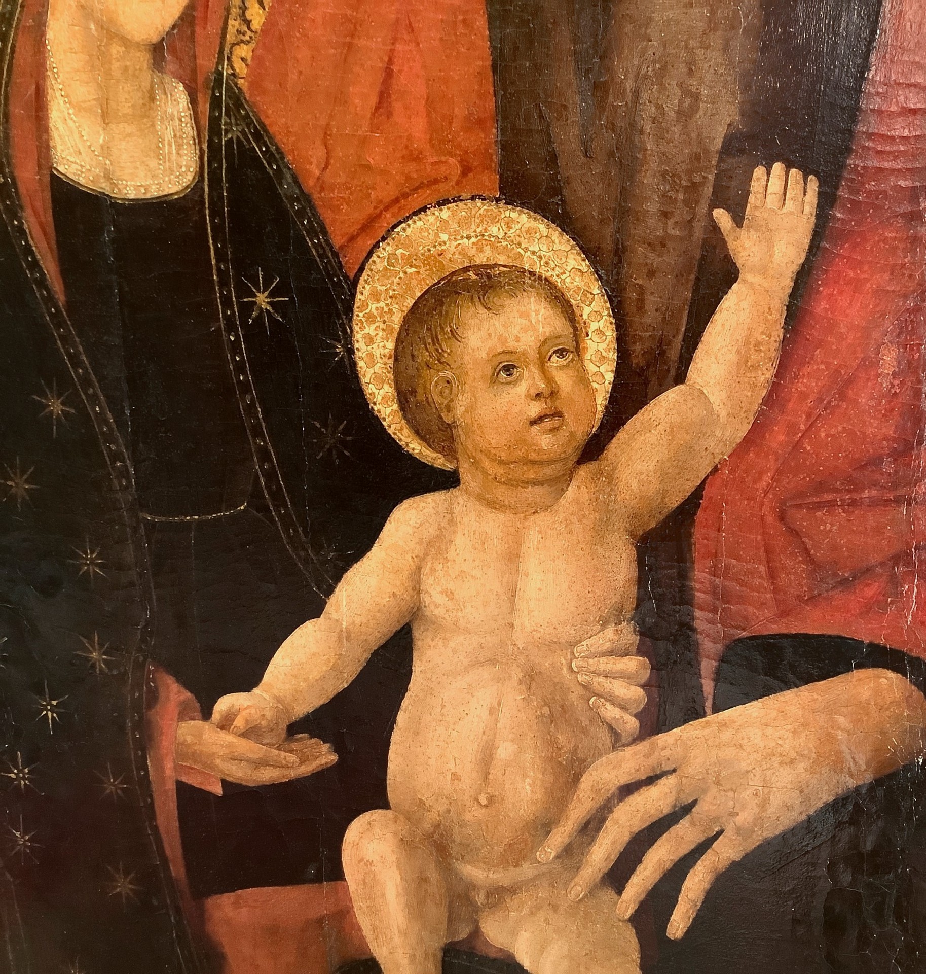 Di estremo interesse è l’ iconografia del fanciullo che sembra slanciarsi fuori dalla composizione manifestando, come salutasse, gioia e affetto verso le due madri. Una modalità iconografica che si riscontra spesso soprattutto nella scuola Catalana come, per ricordare un altro comprimario parallelo al nostro pittore, nel grande Luis Dalmau.
