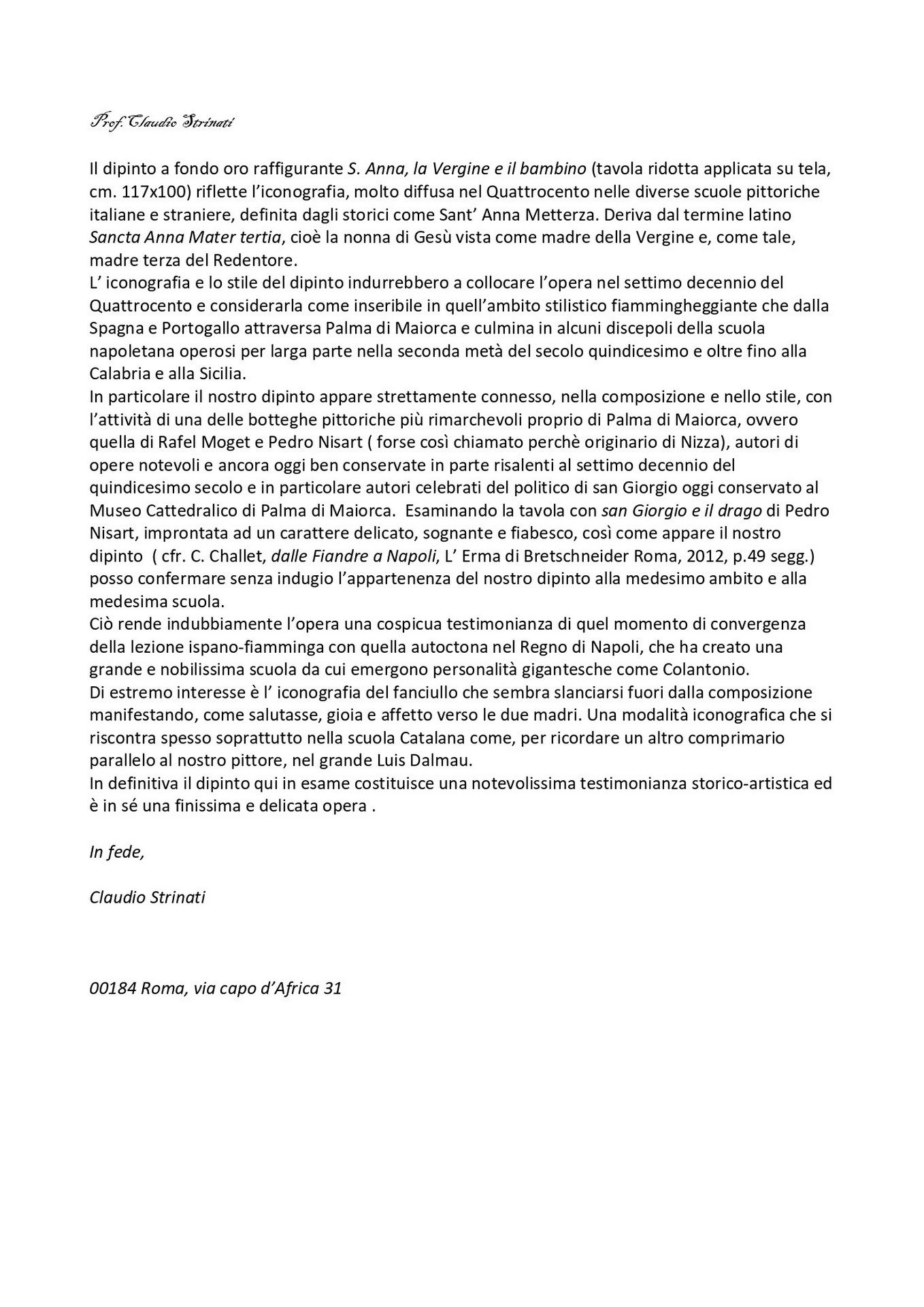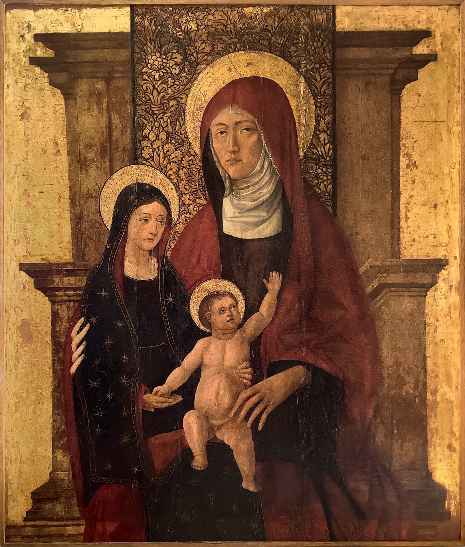 ” Il dipinto a fondo oro raffigurante S. Anna, la Vergine e il bambino (tavola ridotta applicata su tela, cm. 117x100) riflette l’iconografia, molto diffusa nel Quattrocento nelle diverse scuole pittoriche italiane e straniere, definita dagli storici come Sant’ Anna Metterza. Deriva dal termine latino Sancta Anna Mater tertia, cioè la nonna di Gesù vista come madre della Vergine e, come tale, madre terza del Redentore.