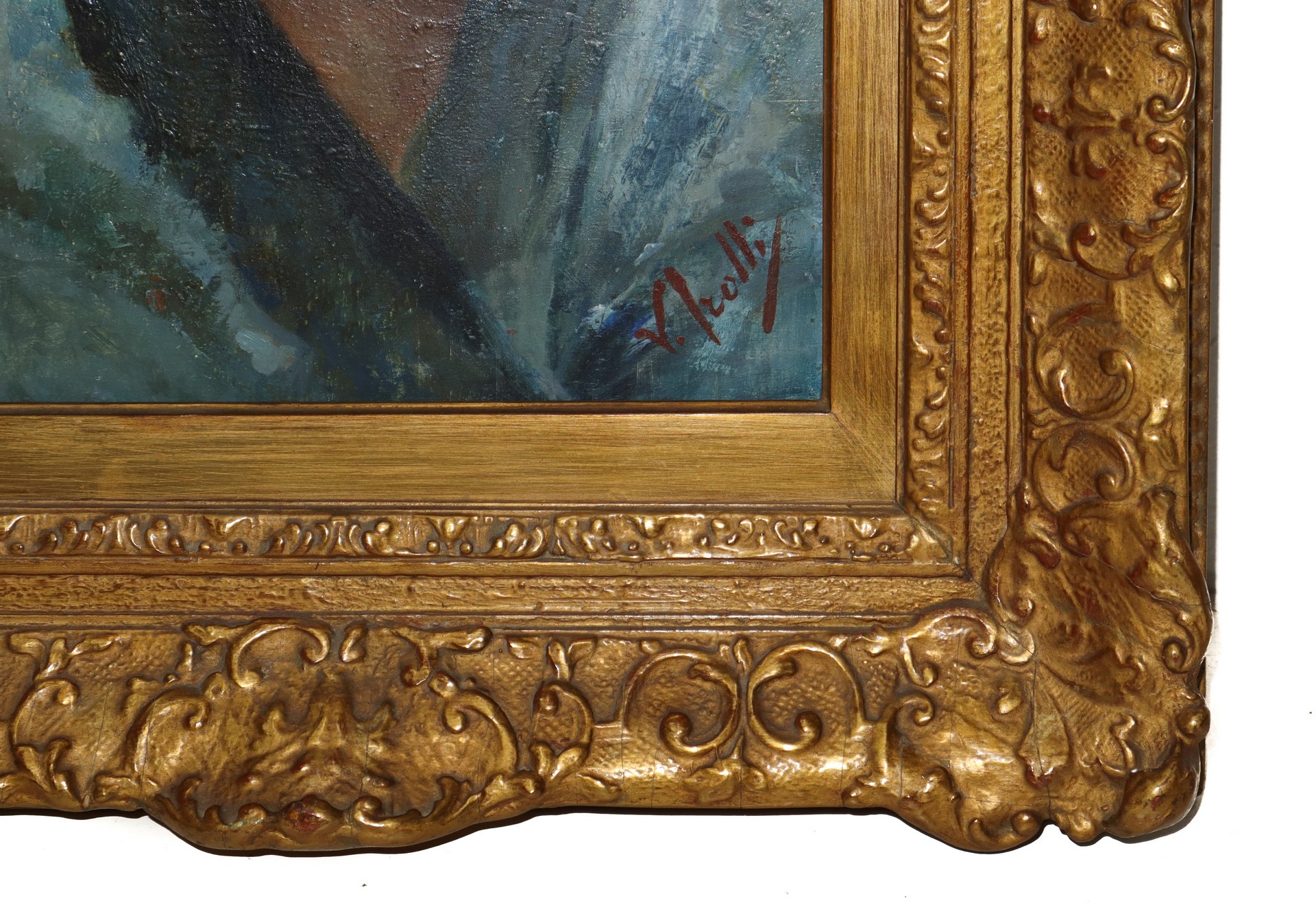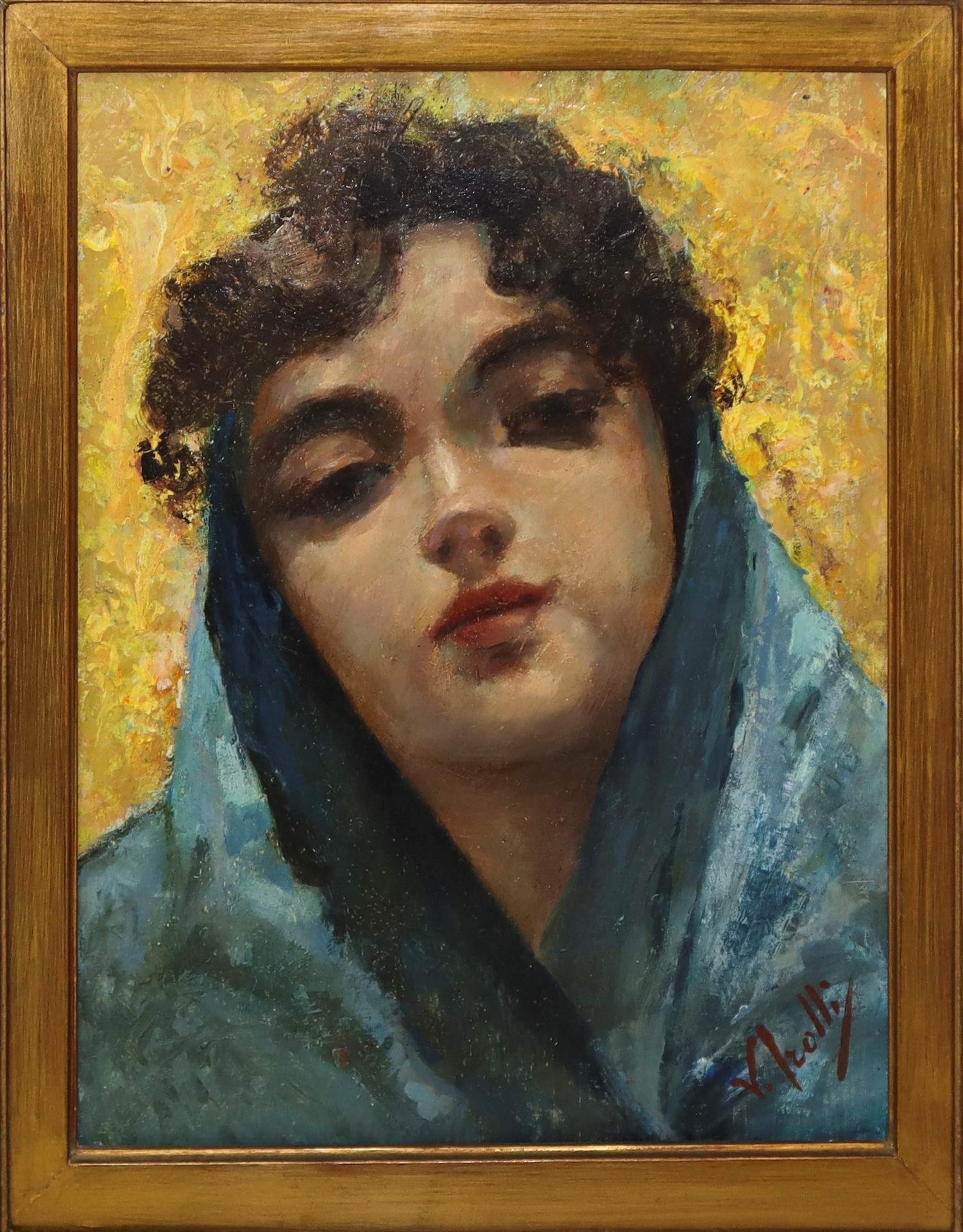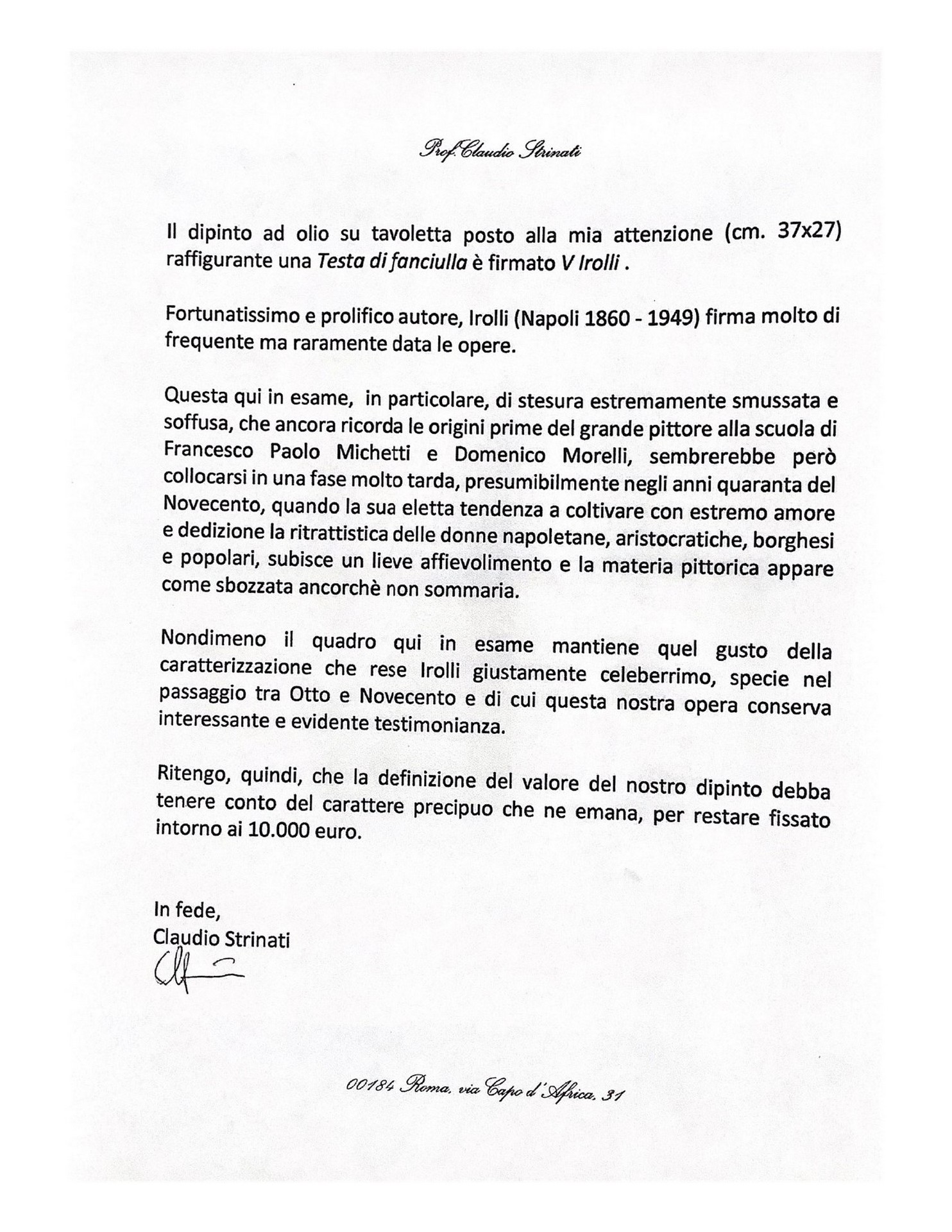 Vincenzo Irolli (Napoli 1860-Napoli 1949) - Testa di fanciulla, 20° secolo H 39 cm x Base 27 cm. In cornice: H 47 cm x Base 37 cm Dipinto ad olio su tavoletta Firmato V. Irolli. Perizia del Prof. Claudio Strinati, con stima pari ad €10.000