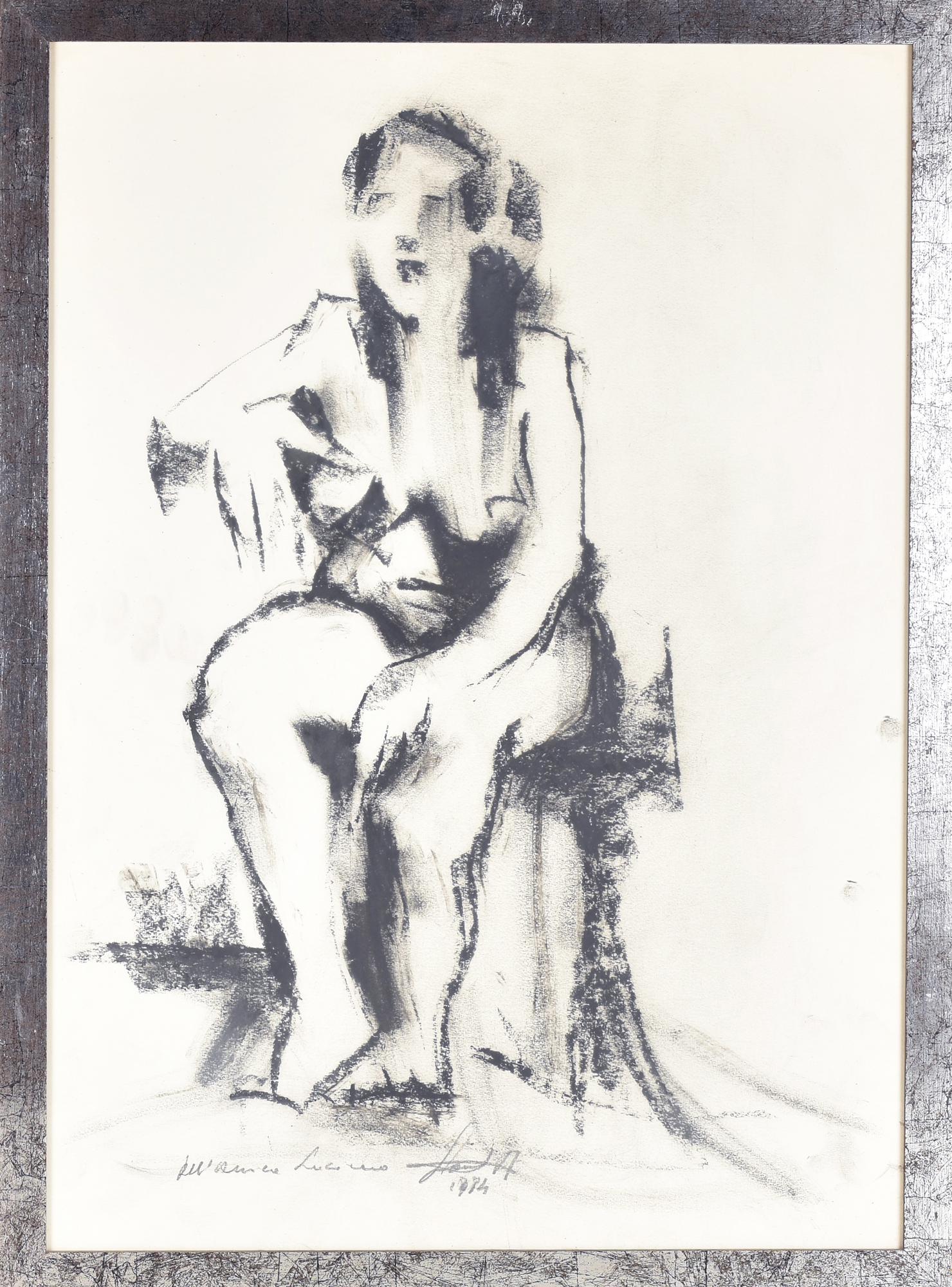Santi NUDO SEDUTO carboncino su carta, cm 70x50 firma, data e dedica ad...