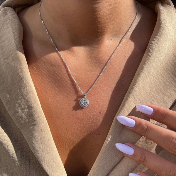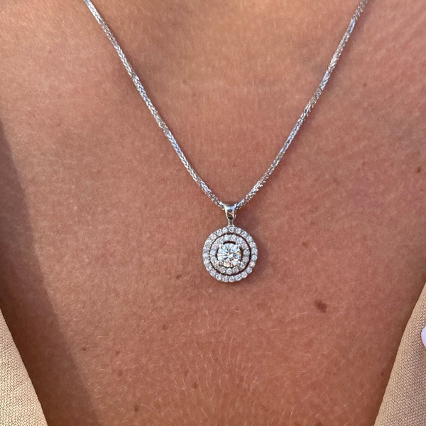 Helena è un ciondolo di diamanti lussuoso e scintillante dal design classico, incastonato con un diamante centrale e circondato da due file di piccoli diamanti, che danno la sensazione di un grande diamante. - CP4149W