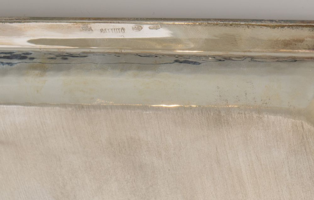 ROSSI & ARCANDI S. n. c., Vicenza, dal 1968. Vassoio polilobato in argento 800. Sul bordo inferiore reca punzoni: losanga locativa 266VI, 800, battuto a mano, sigla dell'argentiere. Cm 31x31. Peso: 727 gr.