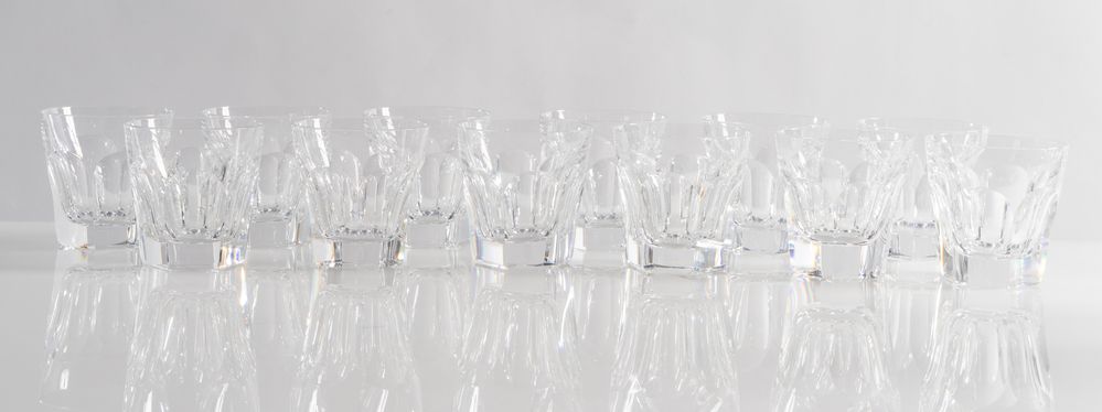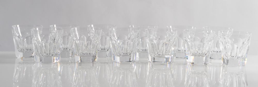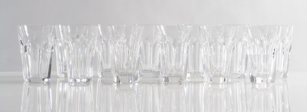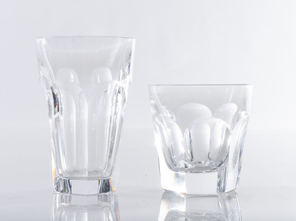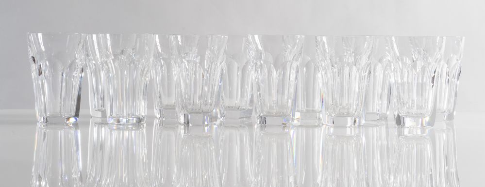 SAINT LOUIS, Francia. Servizio "Chambord" per dodici persone composto da 24 bicchieri in cristallo, di cui 12 da acqua (altezza cm 15) e 12 da cocktail (altezza cm 17). Alla base recano marchio Cristal St. Louis France.