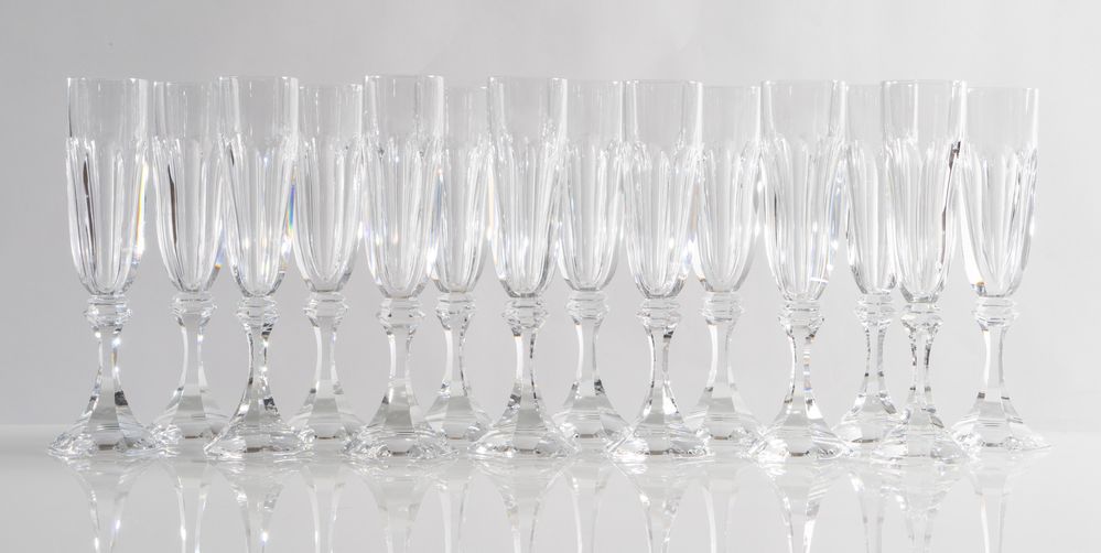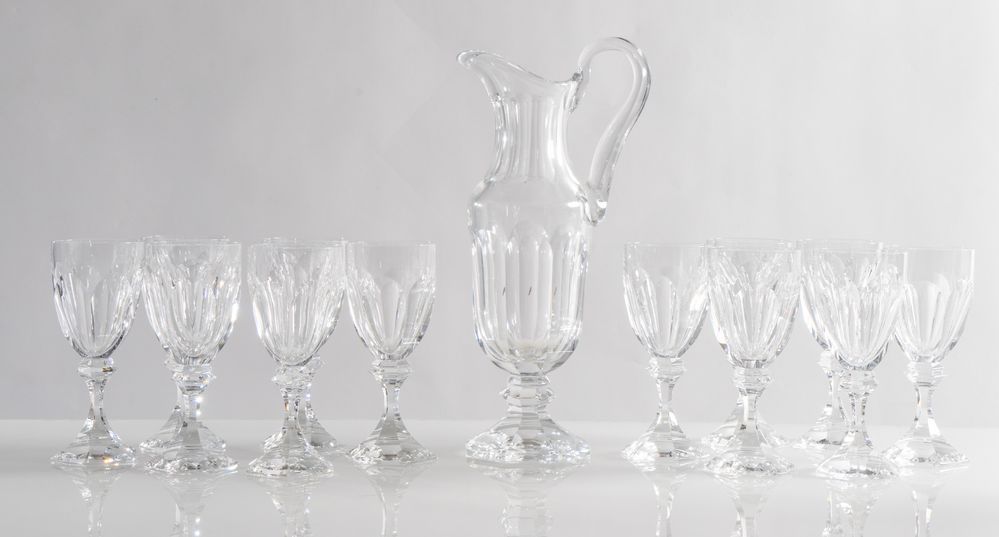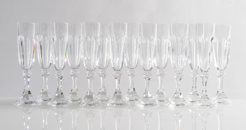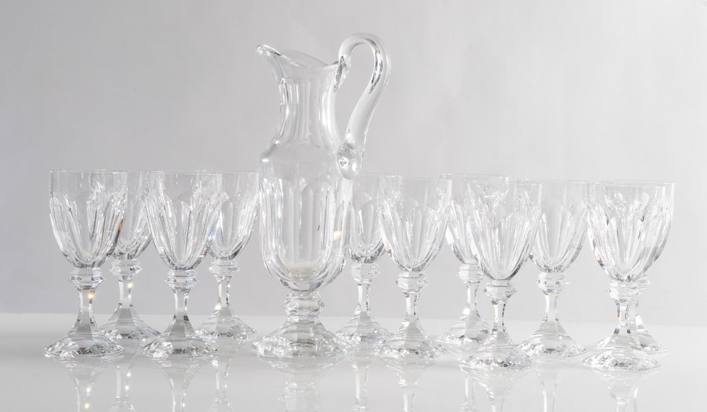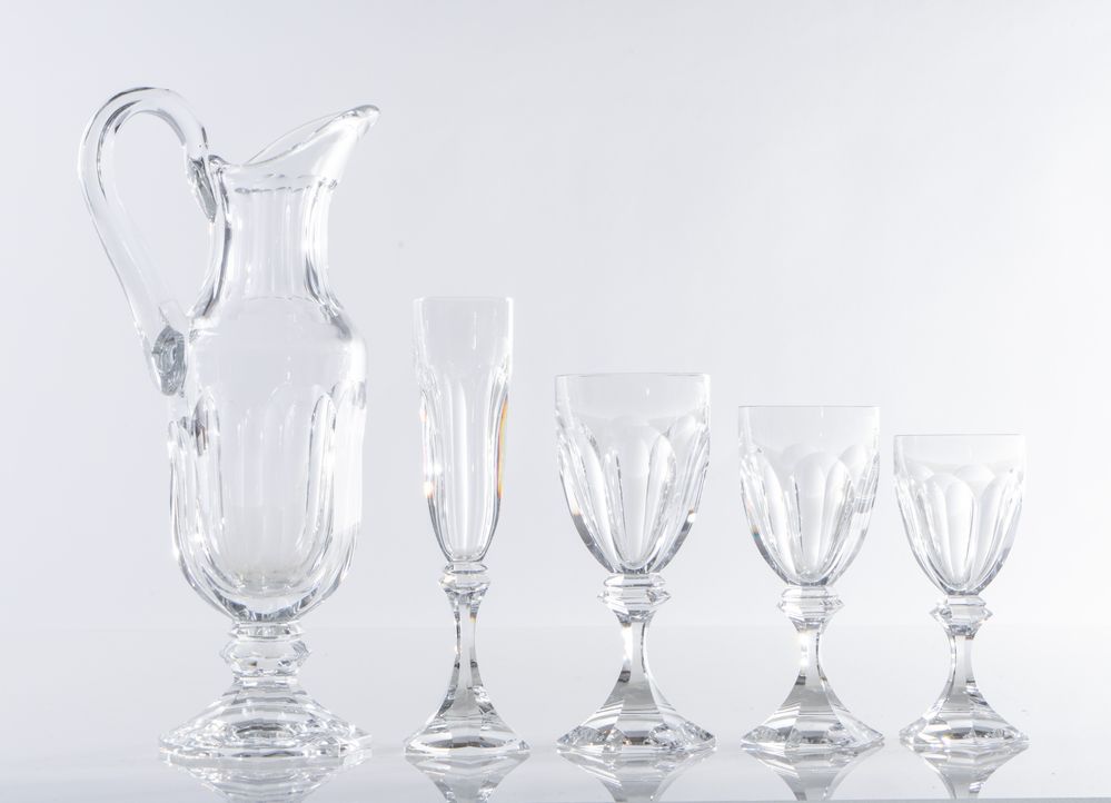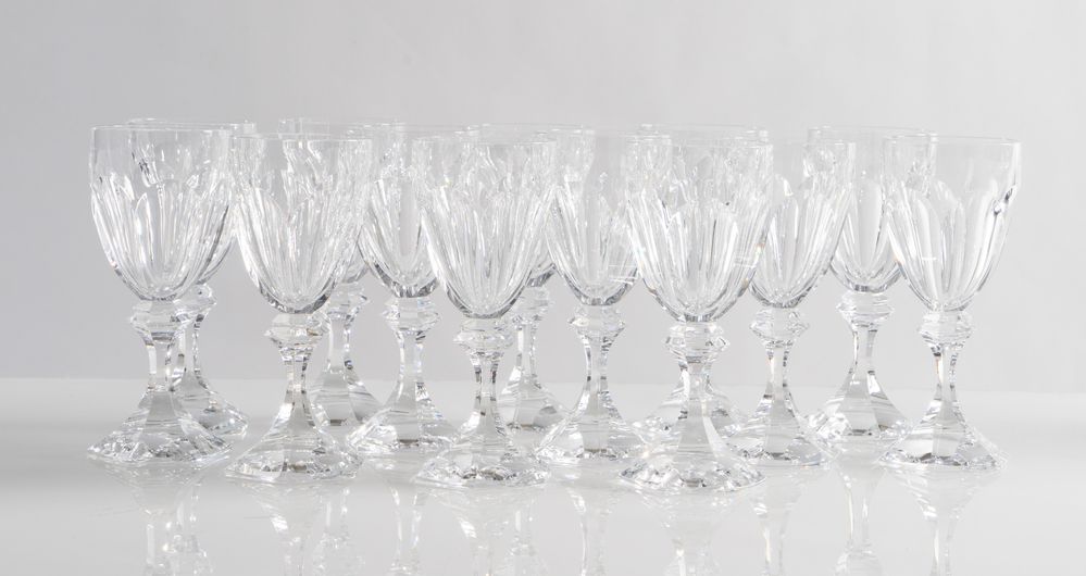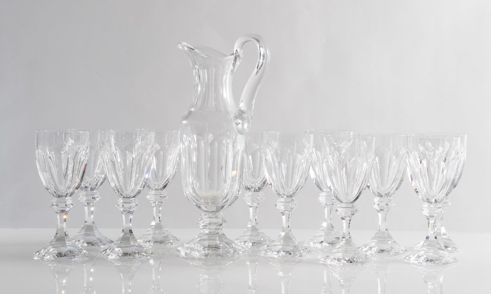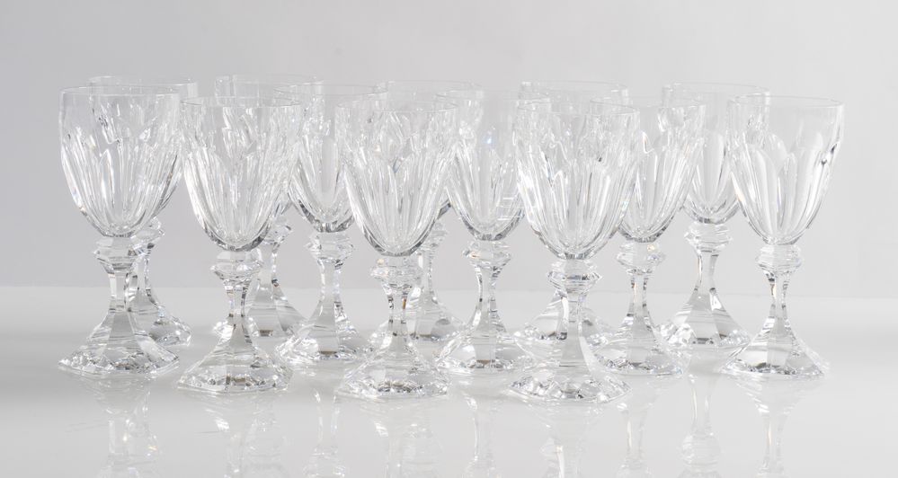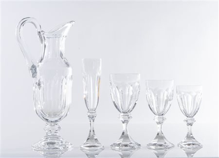 SAINT LOUIS, Francia. Servizio "Chambord" composto da 49 bicchieri, di cui 11 calici da acqua (altezza cm 18,2), 12 calici da vino rosso (altezza cm 16,7), 12 da vino bianco (altezza 15,4), 14 flûte (altezza cm 22,3) e 2 decanter (cadauno di cm 33x15,5x10). Ciascuno alla base reca marchio Cristal St. Louis France.