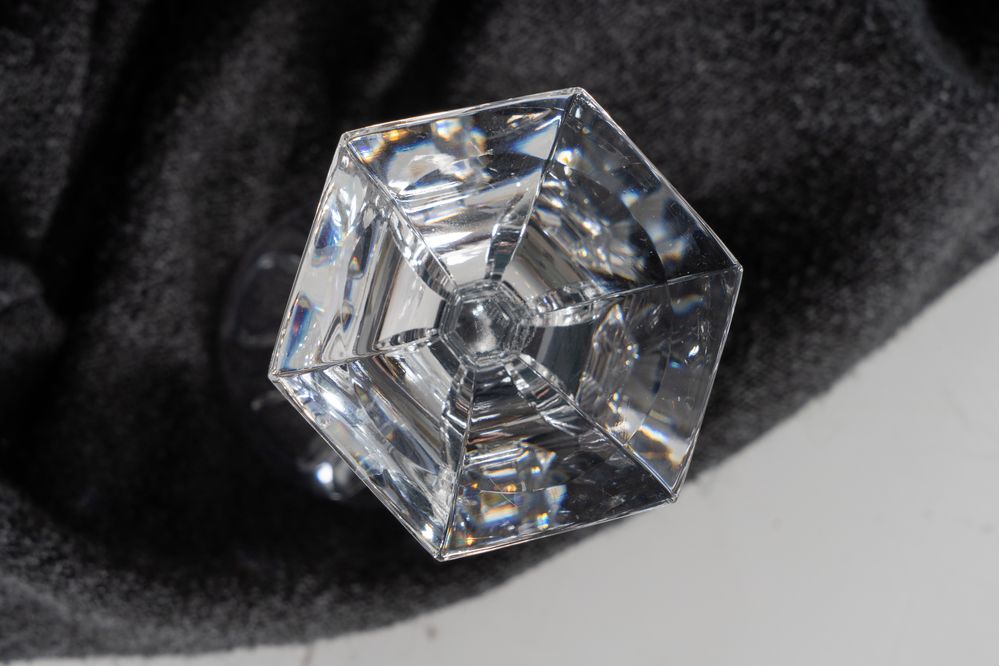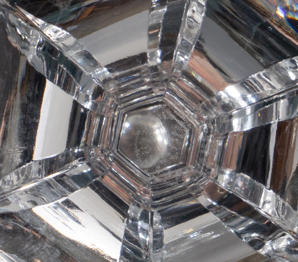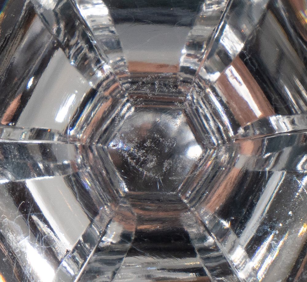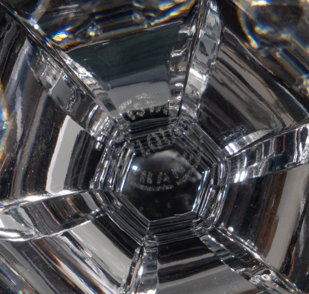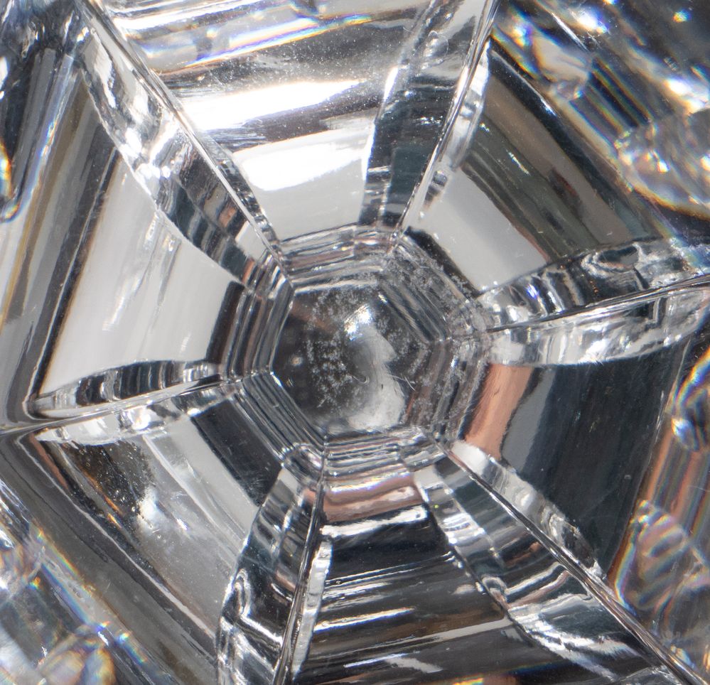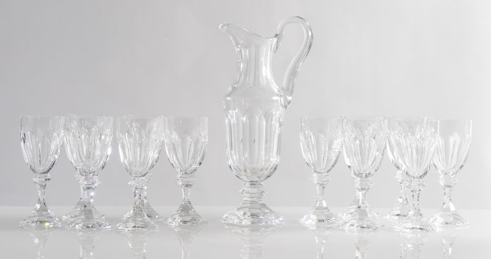 SAINT LOUIS, Francia. Servizio "Chambord" composto da 49 bicchieri, di cui 11 calici da acqua (altezza cm 18,2), 12 calici da vino rosso (altezza cm 16,7), 12 da vino bianco (altezza 15,4), 14 flûte (altezza cm 22,3) e 2 decanter (cadauno di cm 33x15,5x10). Ciascuno alla base reca marchio Cristal St. Louis France.