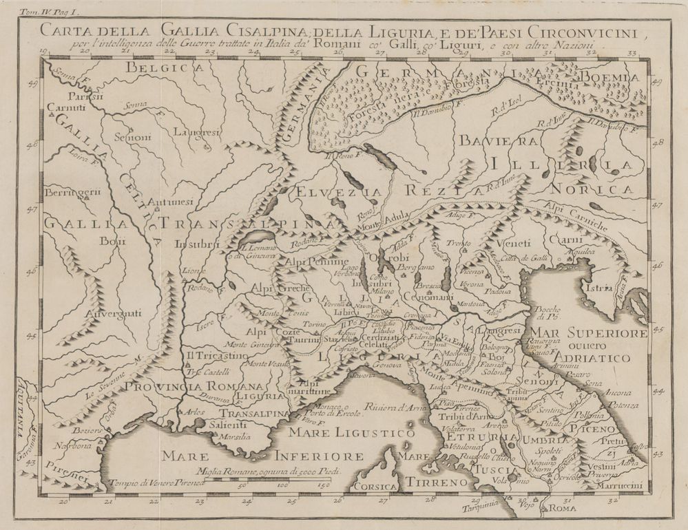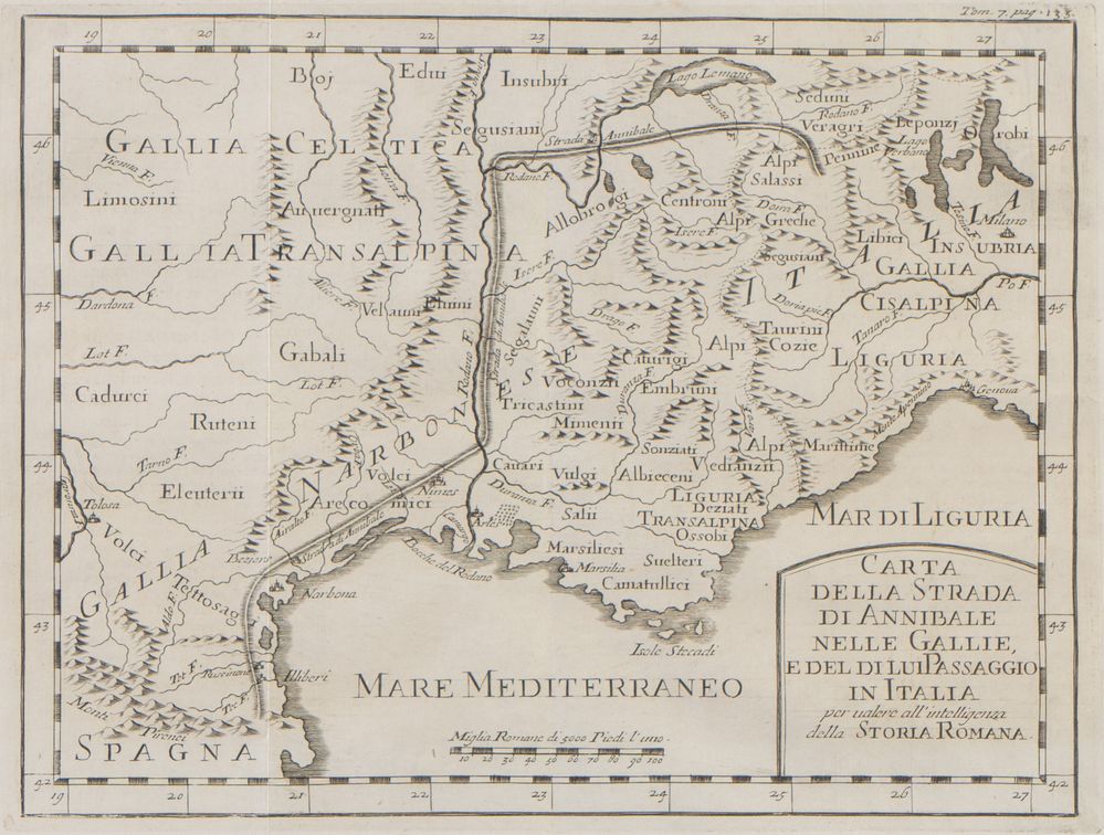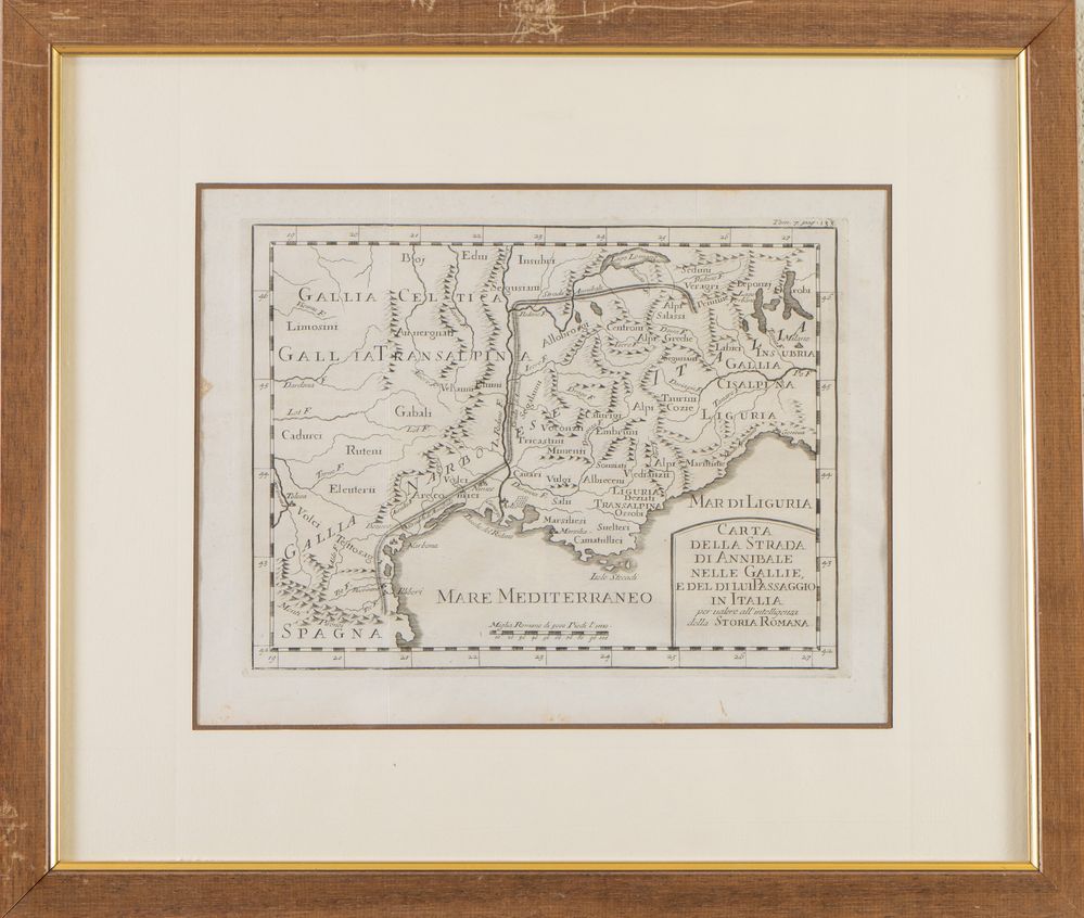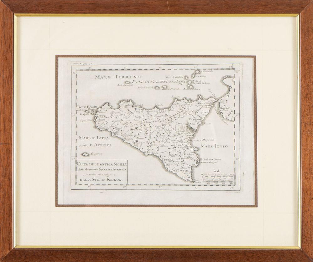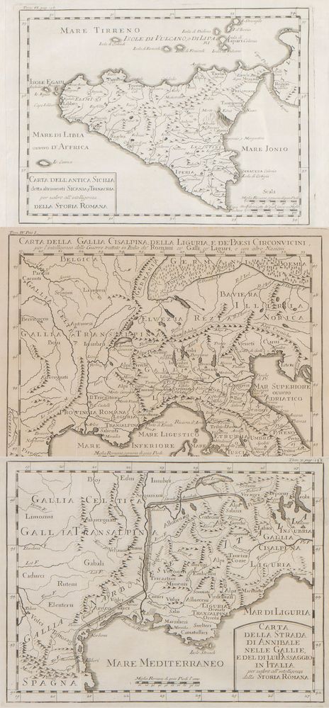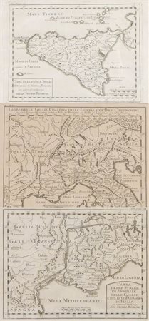 Lotto composto tra tre mappe del XVIII secolo. a. Mappa della Sicilia. Cm 22,5x30. b. Carta raffirugante la Gallia Cisalpina. Lastra: cm 23x30. c. Carta raffigurante la Strada di Annibale. Lastra: cm 22,5x30.