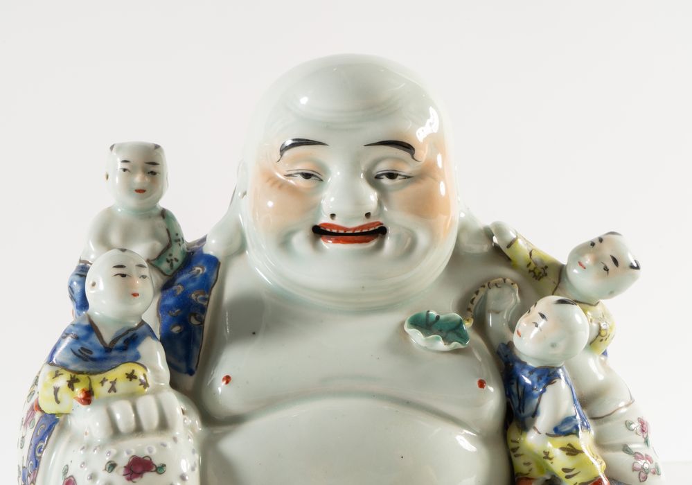 Figura di Buddha seduto contornato da bambini. Scultura in porcellana...