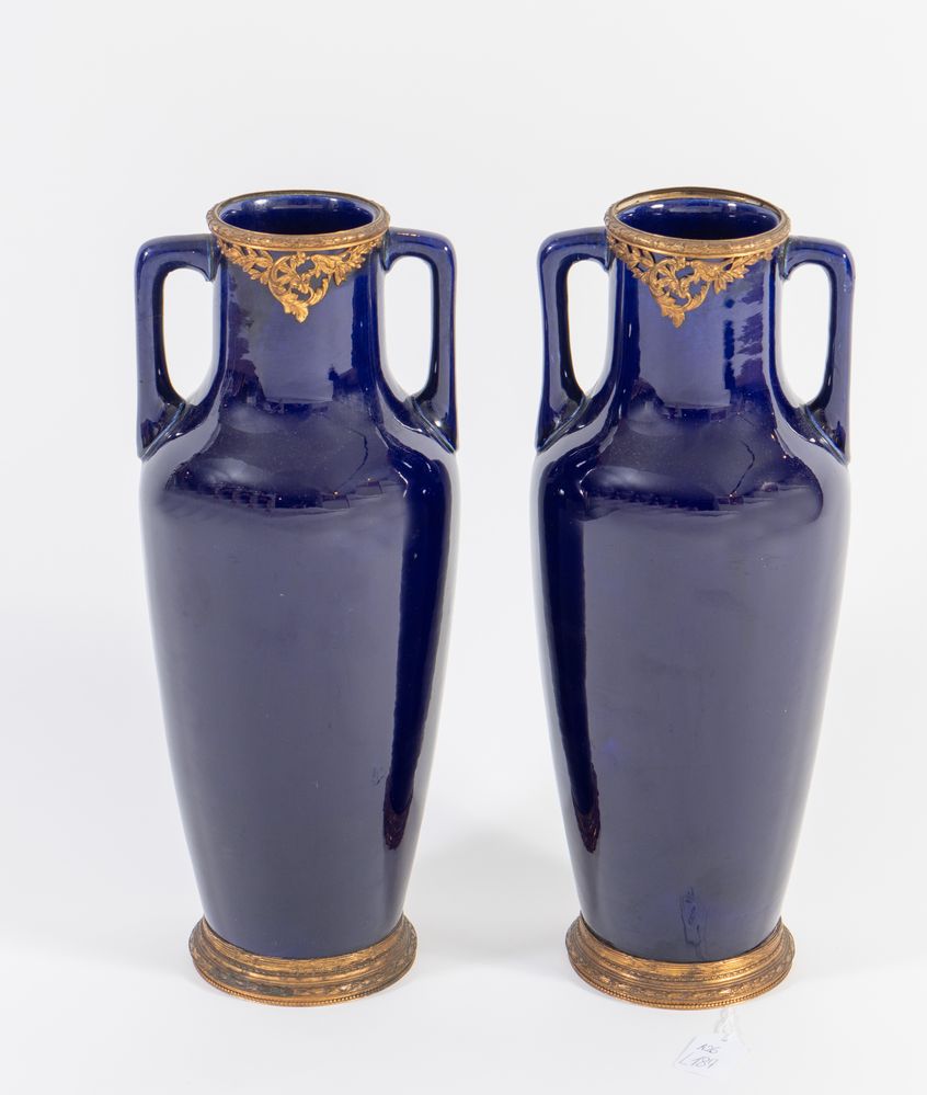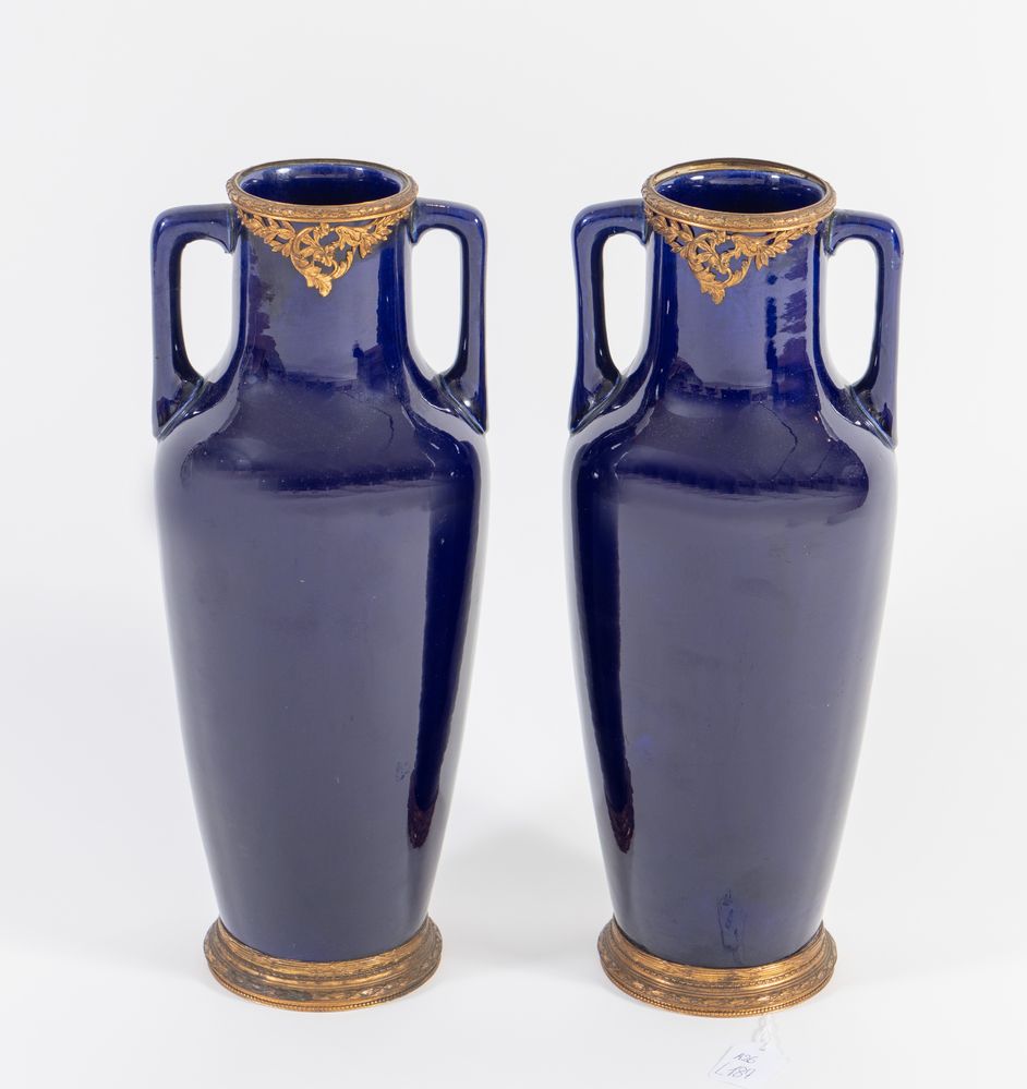 MANIFATTURA SEVRES, Francia, fine XIX secolo - inizio XX secolo. Coppia di vasi in ceramica invetriata con applicazioni in bronzo. Francia, seconda metà del XIX secolo. Cadauno di cm 42x17.