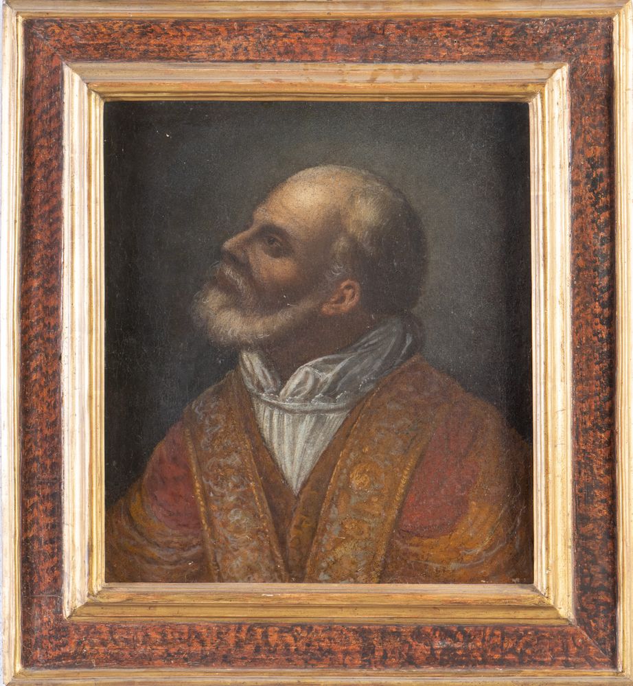 Maestro del XVII secolo. "Santo vescovo". Olio su tela. Cm 45x40. Cornice antica adattata.