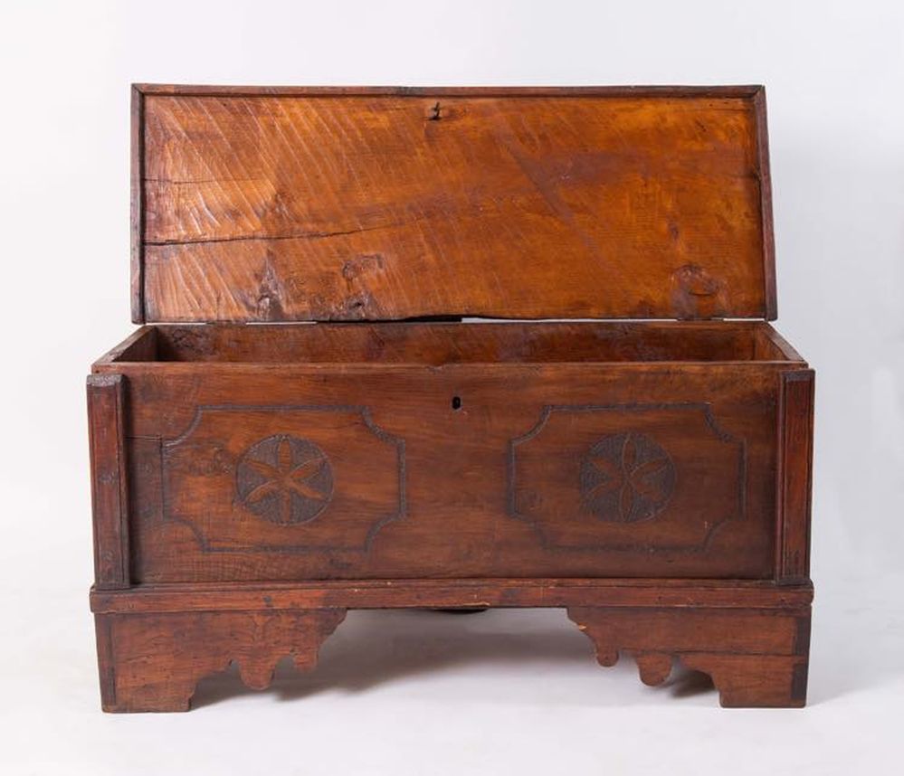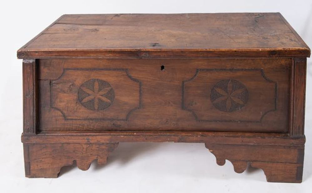 Cassapanca in legno di castagno. Area alpina, inizi del XVIII secolo. Cm 72,5x143x53,5.