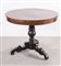 Tavolo rotondo con rosone intagliato filettato in legni esotici. Piano in...