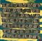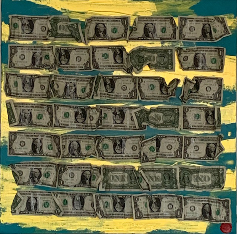 Tecnica mista colore acrilico azzurro ed oro con applicazione di banconote americane 1$ - Con luce ultravioletta appaiono scritte con colore fotosensibile verde