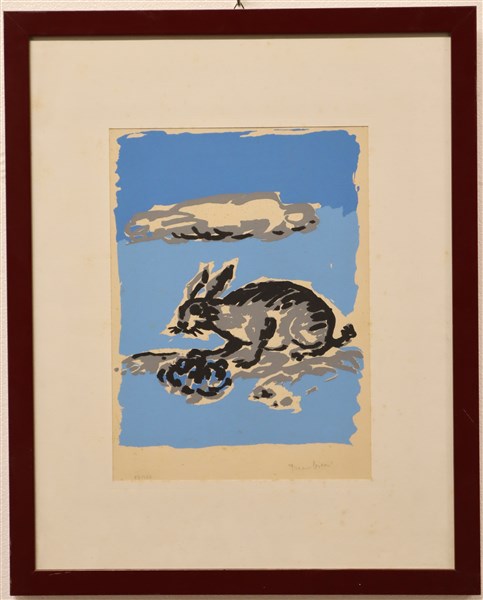 Lotto composto da un'acquaforte raffigurante due volti (foglio cm 48x63) e una litografia a colori raffigurante coniglio (foglio cm 34x25 circa) firmate e numerate in basso a matita