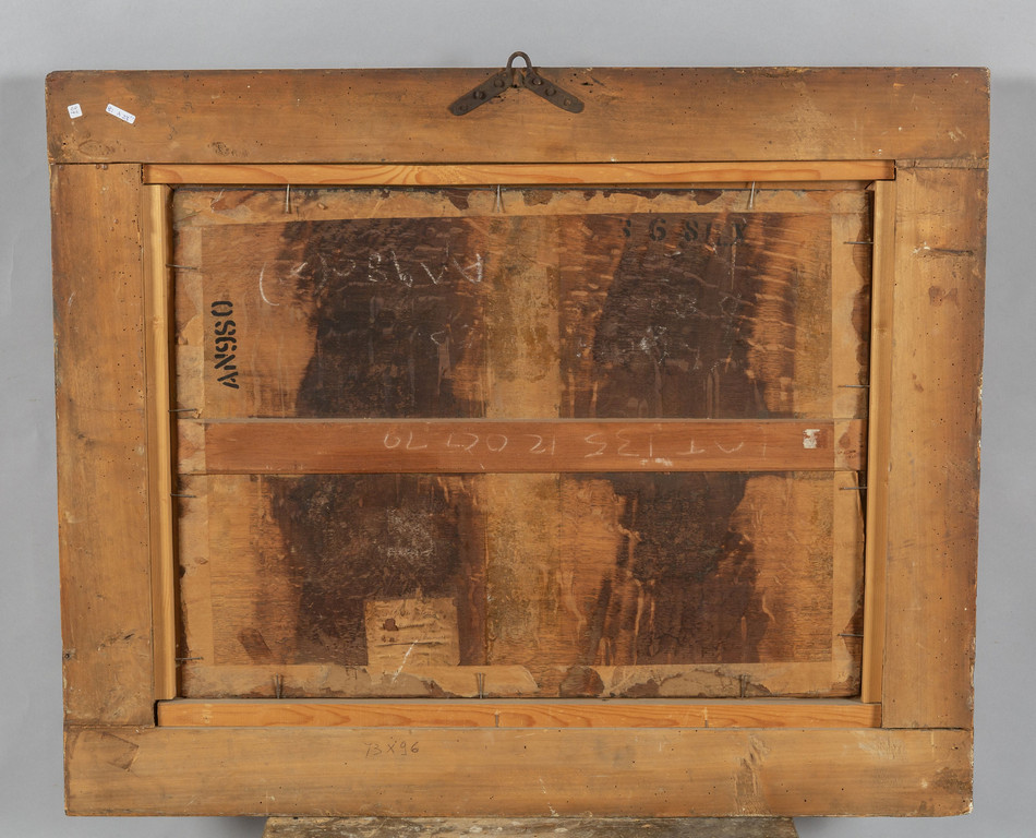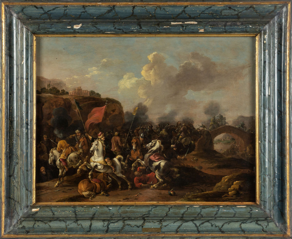 Scuola fiamminga sec.XVII (F.V.Donn) "Battaglia" olio su tavola, cornice coeva in legno marmorizzato