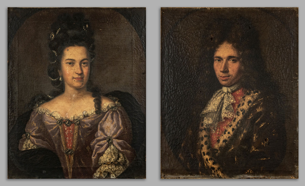 Scuola lombarda sec.XVII "Gentildonna con treccia e perle" e " Gentiluomo con sciarpa bianca" coppia di olii