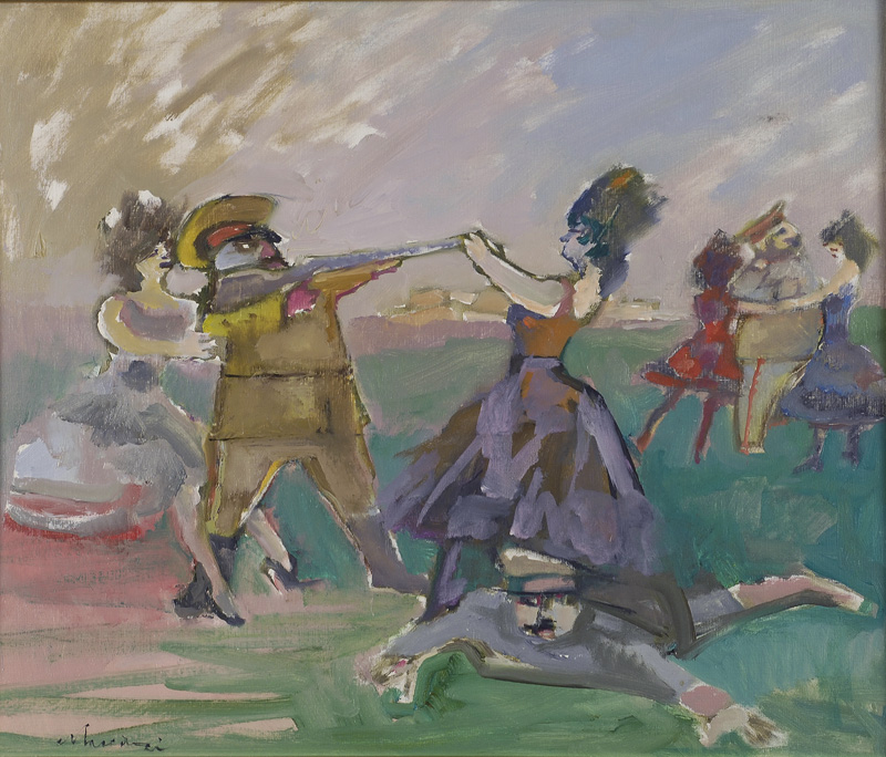 Mino Maccari (Siena, 1898 - Roma, 1989) GUERRIERI E DONNETTE, 1964-65 Olio su cartone telato, cm. 50x60 Firma in basso a sinistra. Sul verso, titolo, data e dichiarazione di autenticità dell’autore; Galleria d’Arte Cavour, Forte dei Marmi; Galleria d’Arte Internazionale, Milano. Autentica su foto dell’Archivio Maccari.