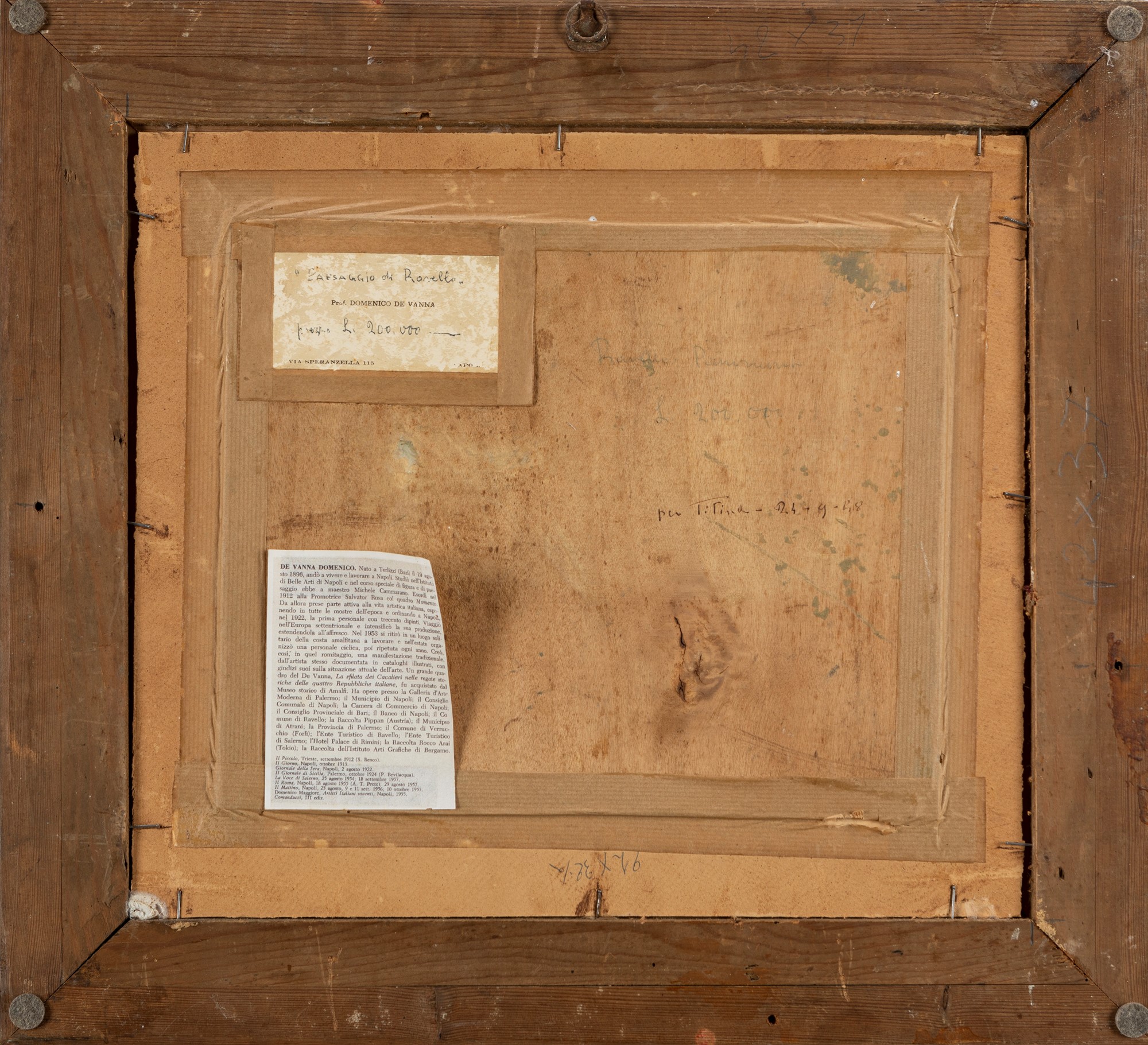 Sul retro, sul supporto, etichetta del pittore con titolo.
