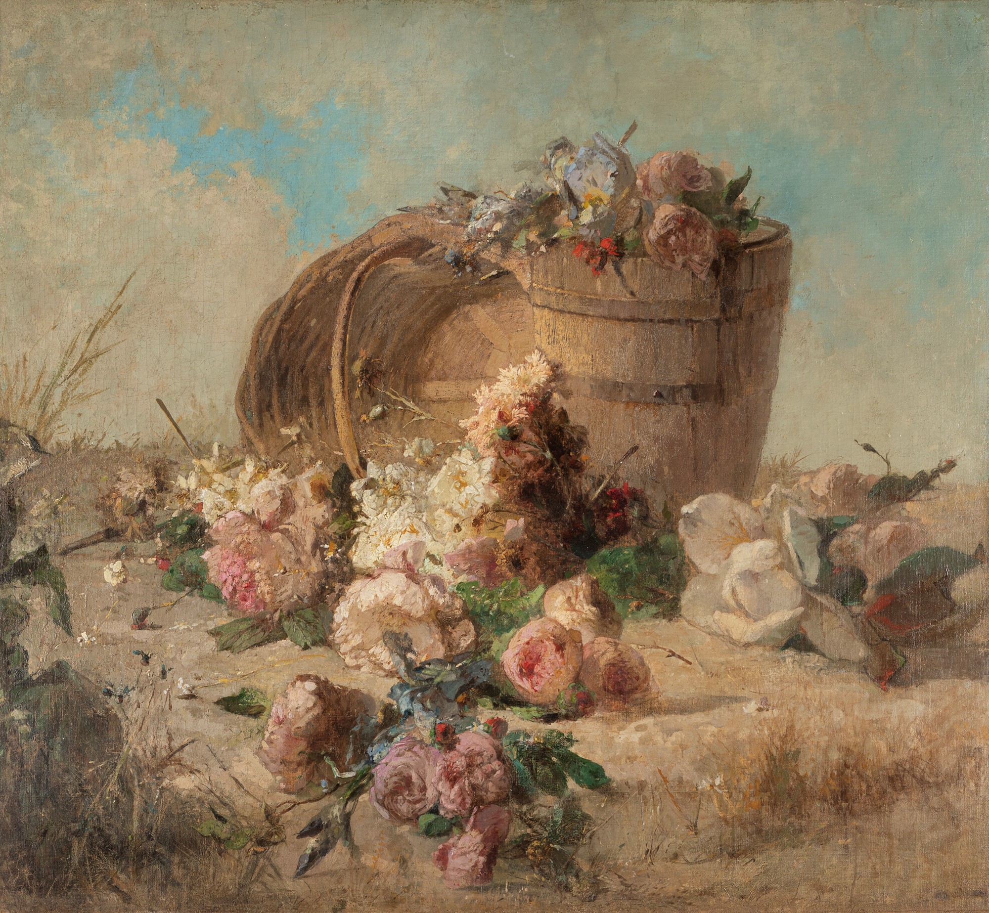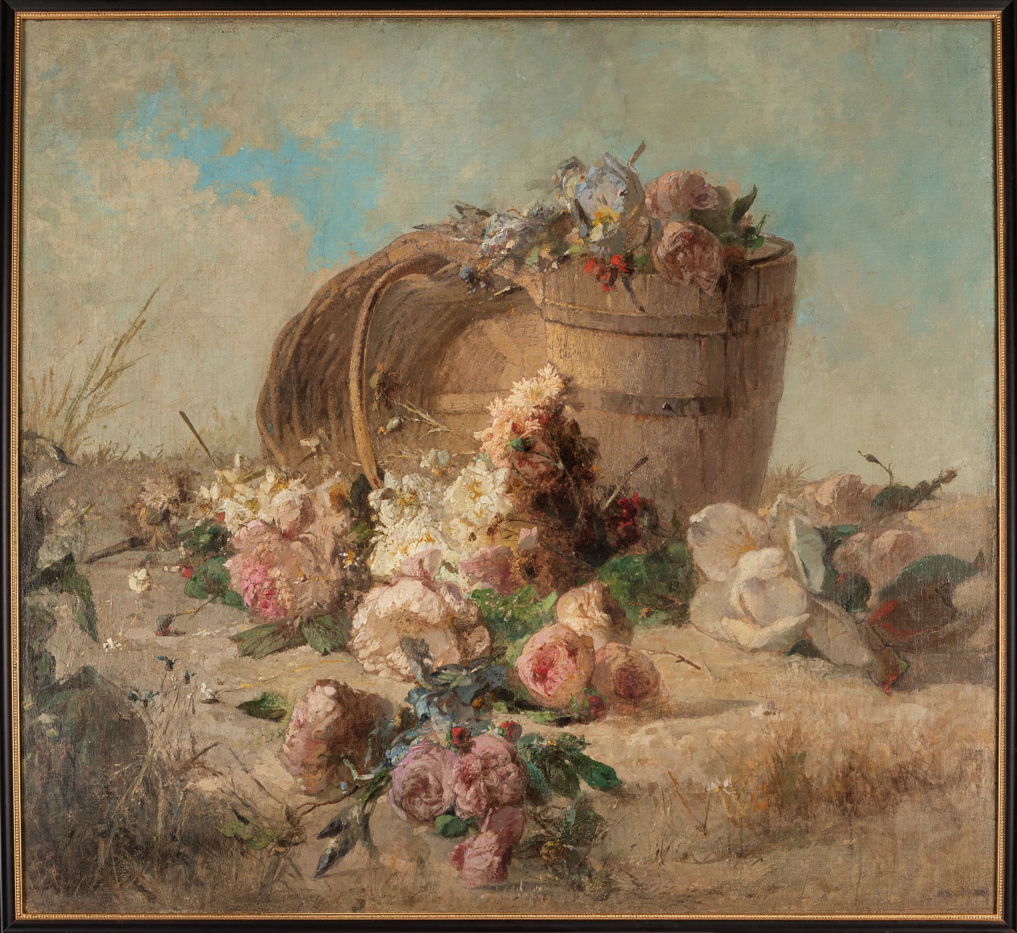 Capolavoro di Luigi Scrosati, la monumentale tela rappresenta, ad oggi, la più grande realizzazione sul tema prediletto dal pittore che si conosca. Come scritto di recente da Alessandro Oldani per la voce sul Dizionario Biografico degli Italiani, la produzione di Scrosati – maestro indiscusso nel genere della natura morta floreale – va suddivisa in due momenti distinti; quella degli anni Quaranta, con evidenti influenze della scuola di Lione e quella dopo il 1857, che presenta accenti hayeziani e tedeschi di matrice biedermeier (A. Oldani, Scrosati, Luigi Ambrogio, in Dizionario Biografico degli Italiani, Roma, 2018, vol. 91). Questo trionfo, che pare uno spaccato della campagna con i fiori ancora freschi caduti accidentalmente dal secchio in legno e dal cesto in vimini, dimostra chiaramente la perizia raggiunta da Scrosati, capace di superare Hayez su tale campo, tanto i fiori sono resi con senso tizianesco del colore e la nota rosa cosparsa sul registro inferiore conferisce un tono onirico al tutto.