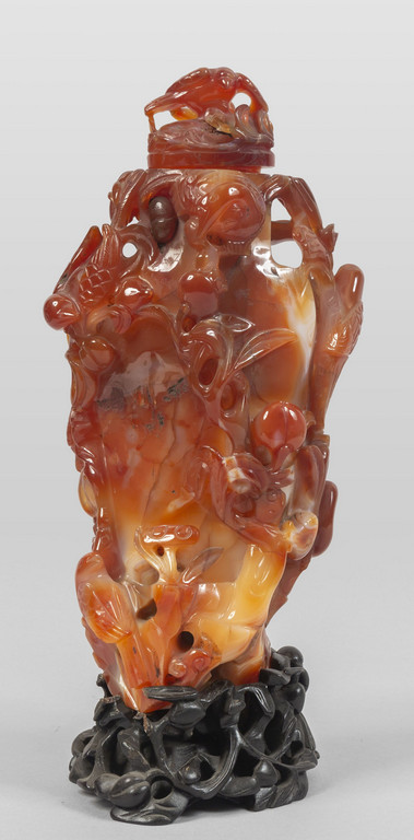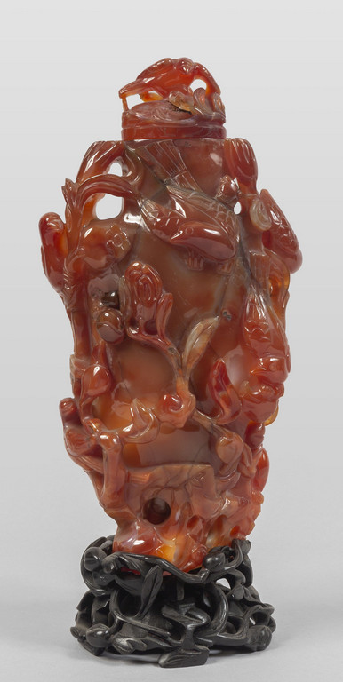 Grande vaso in agata intagliata a motivi di pesche e uccelli, Cina inizi sec.XX