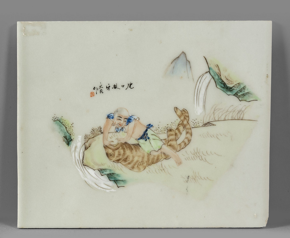 Uomo che lotta con felino, piastrella dipinta, Cina inizi sec.XX