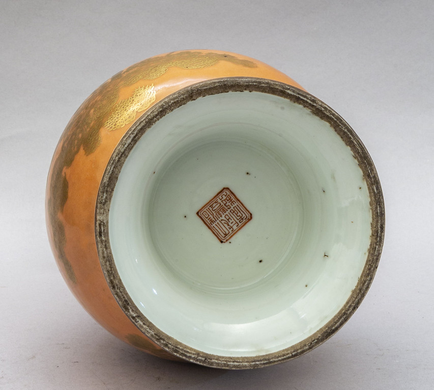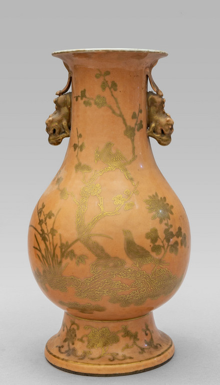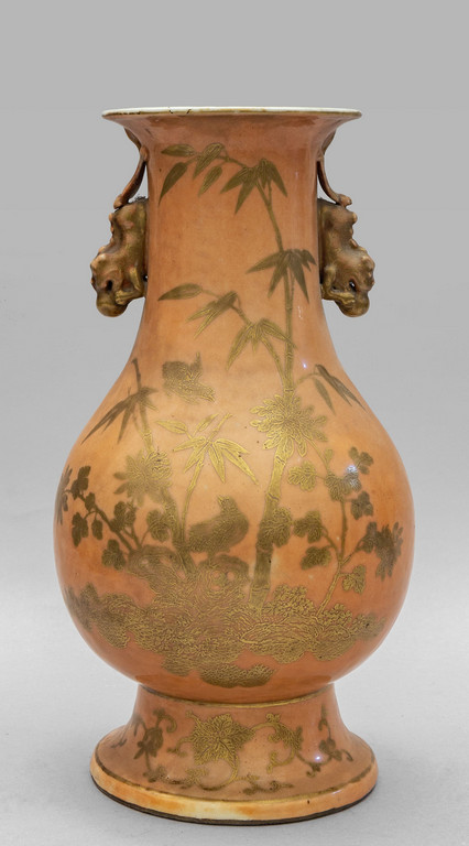 Vaso in porcellana a fondo rosa con decorazioni in oro a forma di uccelli e bambù, manici a forma di cani di Pho, marcato sul fondo, base in legno intagliato, Cina sec.XIX