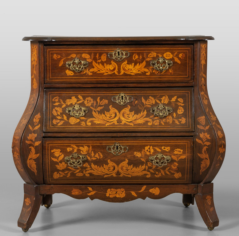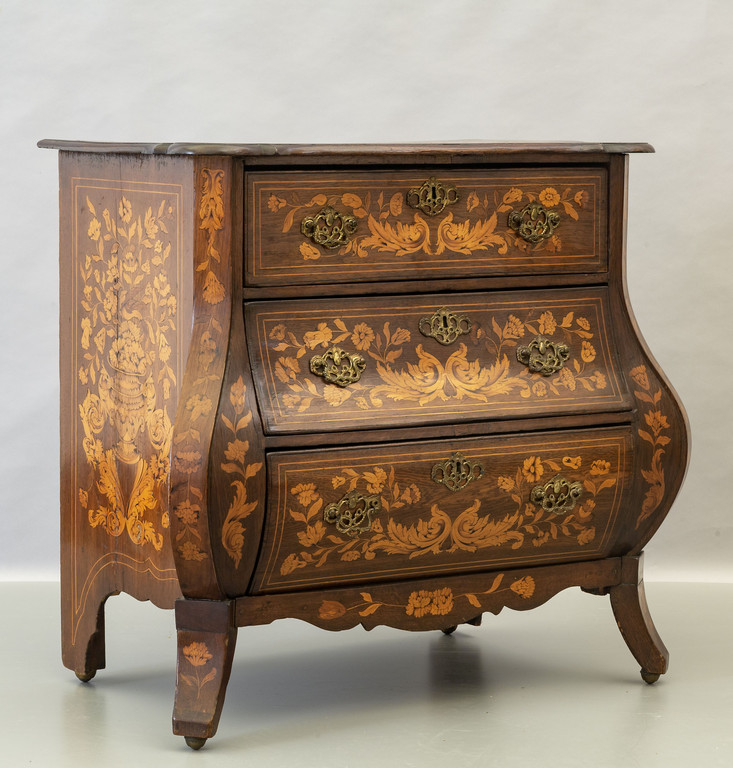 Piccolo comò movimentato sul fronte a tre cassetti, lastronato ed intarsiato con motivi floreali, Olanda sec.XIX