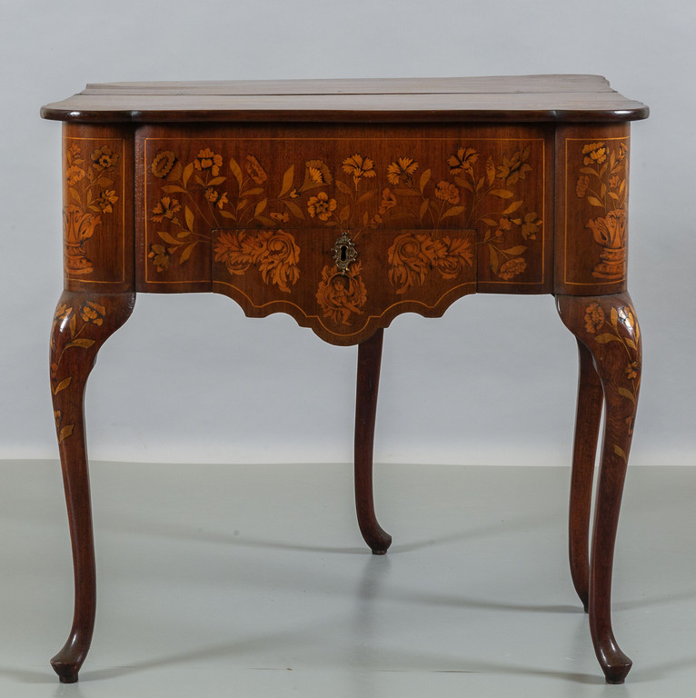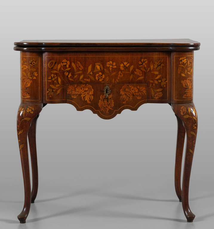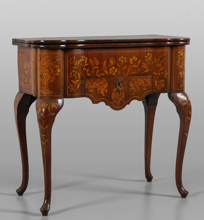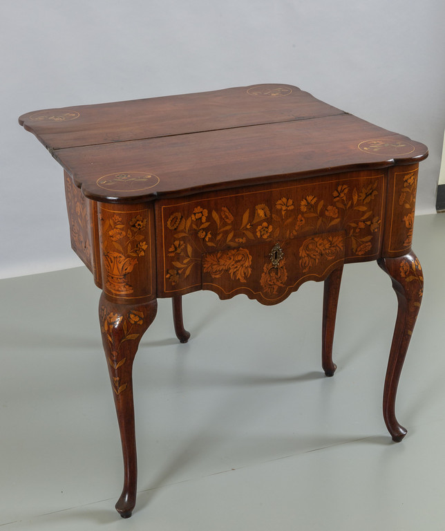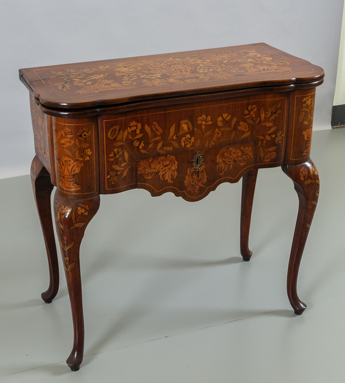 Tavolo da gioco con piano a libro movimentato sul fronte e sui fianchi a motivi floreali, un cassetto sul fronte e uno laterale, Olanda sec.XIX