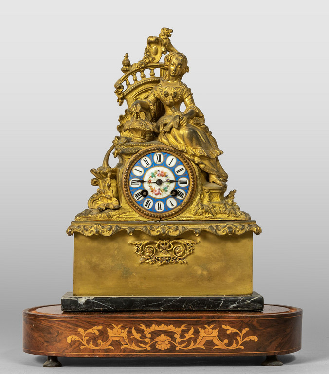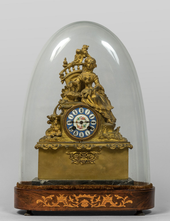 Orologio in bronzo dorato raffigurante giovane donna con cestino e colomba, quadrante in porcellana policroma, base in marmo, Francia sec.XIX, dentro campana di vetro con base in legno lastronato
