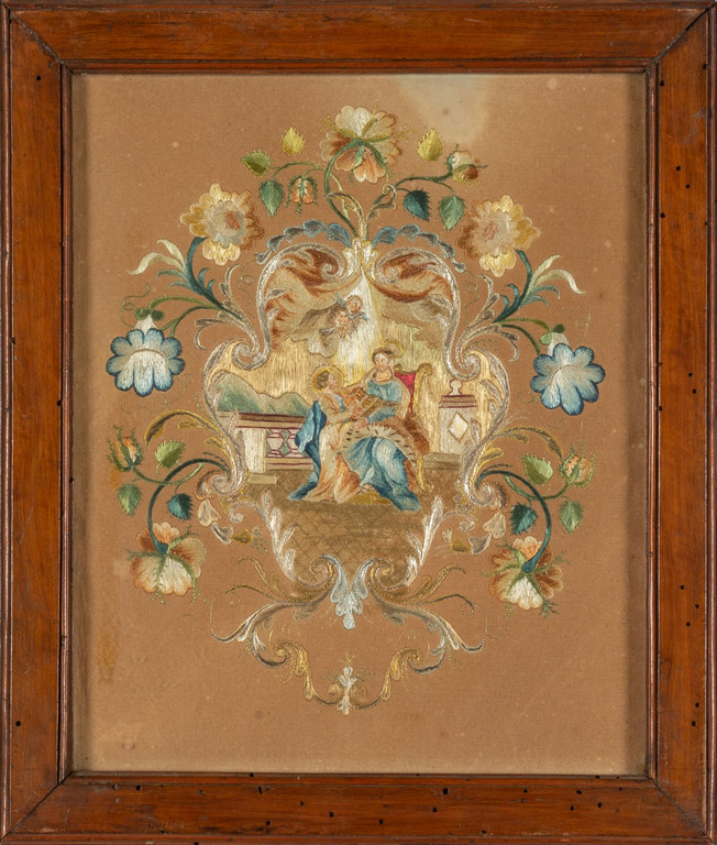 L'educazione della Vergine, ricamo a doppia faccia in fili colorati ed argento, sec.XVIII