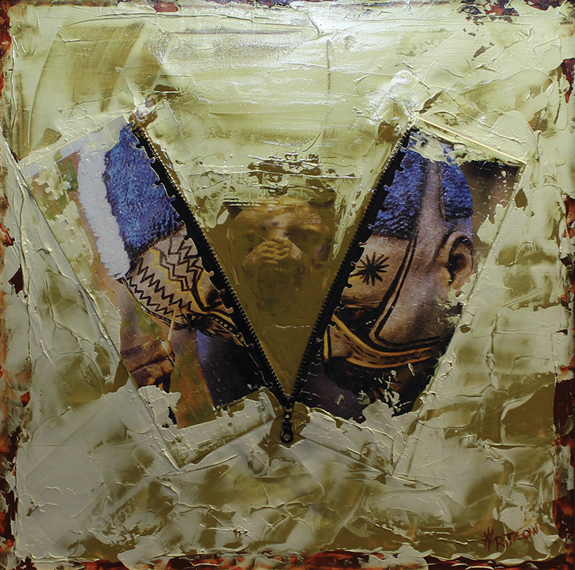 Ritzow Charlotte Hiding place, 2002 tecnica mista e collage su tela, cm. 50x50 firmata in basso a destra, certificato di autenticità ed archiviazione con timbro e firma dell'artista al retro
