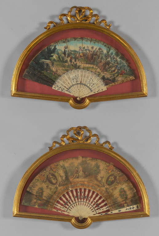 Coppia di ventagli entro teca in legno dorato, sec.XIX