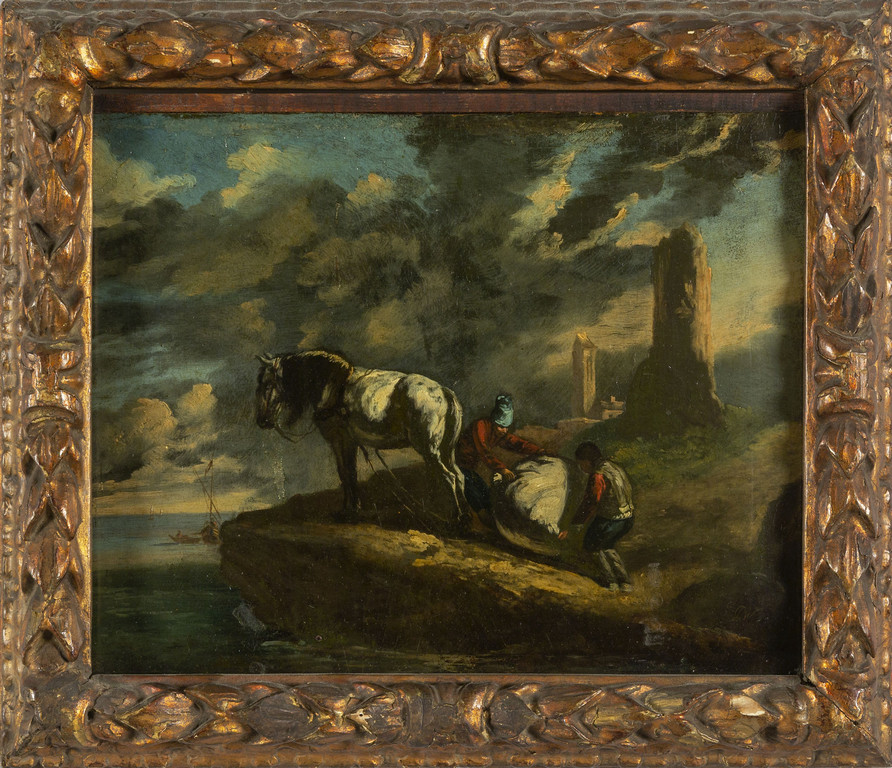 Philip Wouwerman (Harlem 1614-1668) "Paesaggio con cavallo e personaggi" olio su tavola, s.to P.W. in b. a ds.