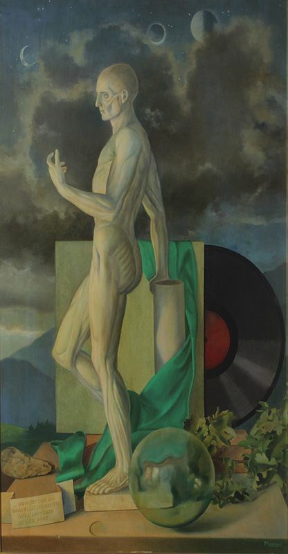 Mezzoli Olmedo Persistente unità con l'universo in marcia, 1965 olio su tavola, cm. 80x50 firmato in basso a destra