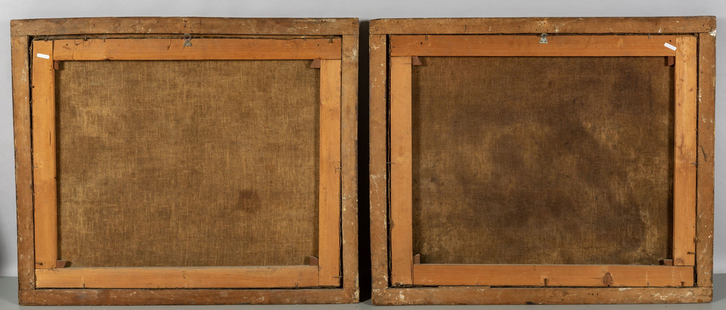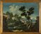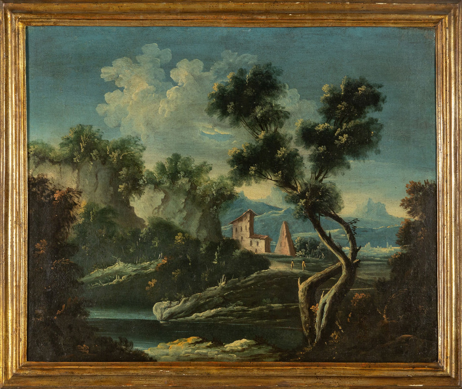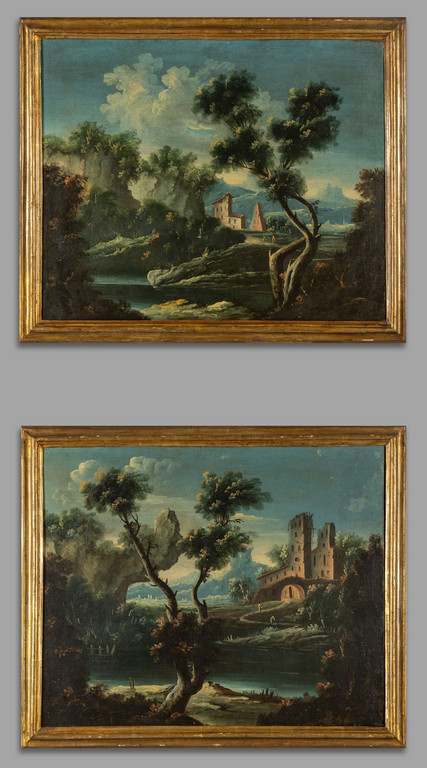 Scuola veneta sec.XVIII "Paesaggi animati con figure" coppia di olii, cornici coeve in legno dorato