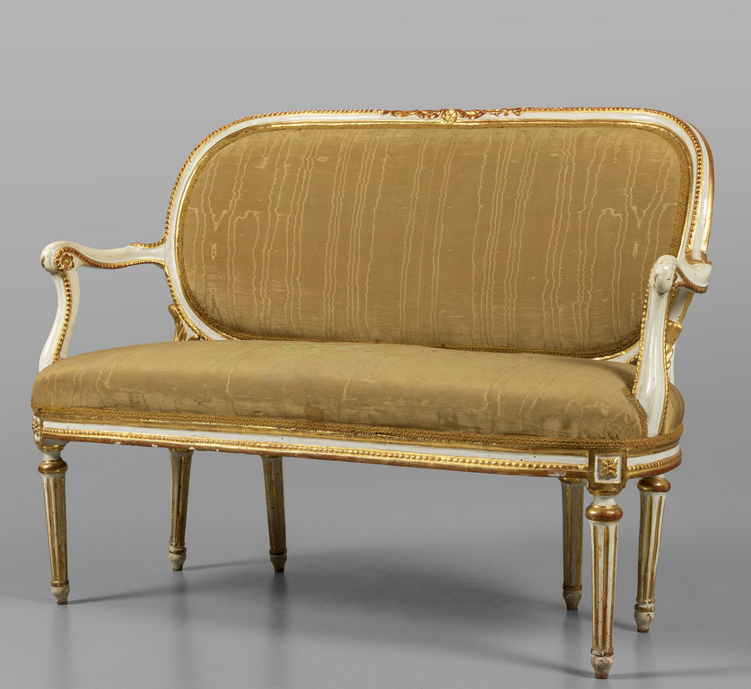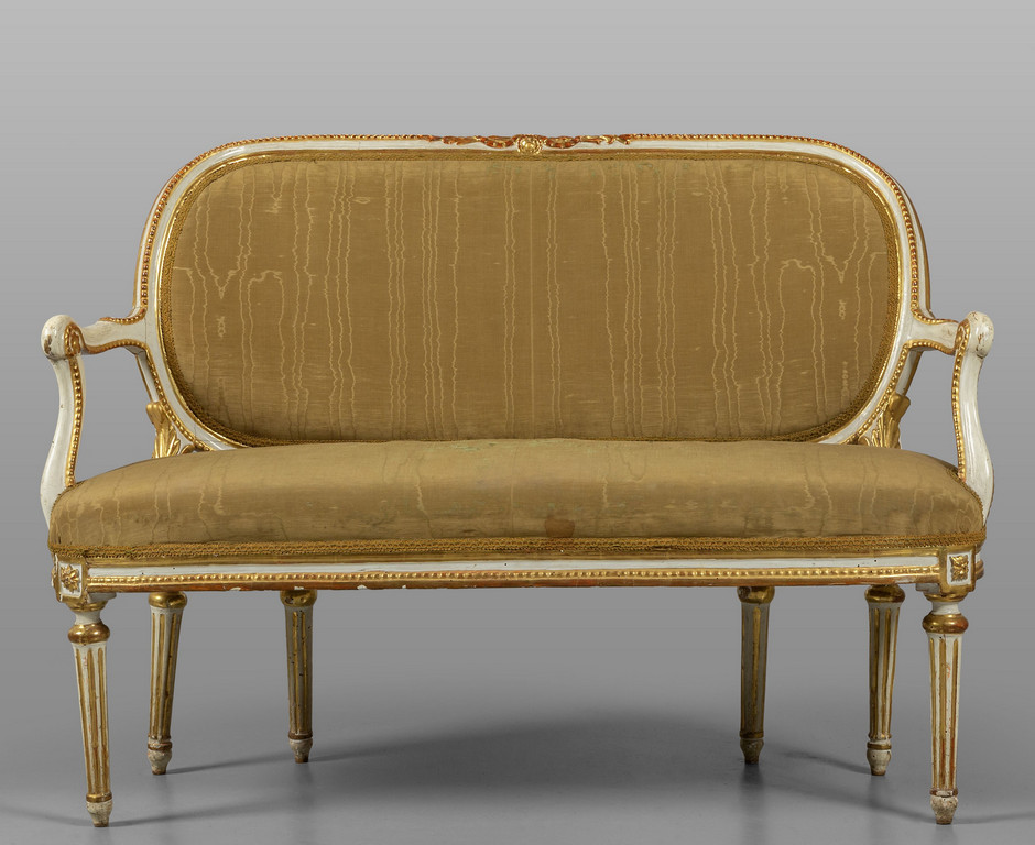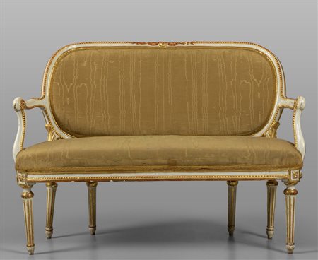 Divanetto Luigi XVI in legno intagliato, laccato e dorato, schienale ovalino, Napoli II metà sec.XVIII