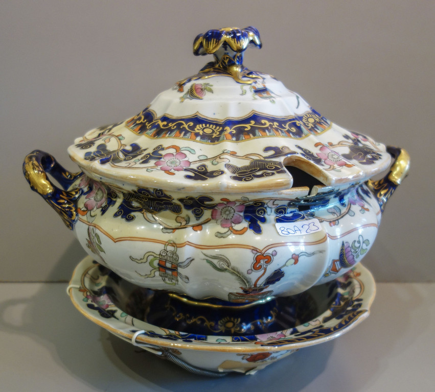 Zuppiera, coppia di zuppierine con sottopiatto e nove piatti di misure diverse in terraglia Masons' ad imitazione della porcellana orientale, Inghilterra sec.XIX