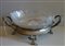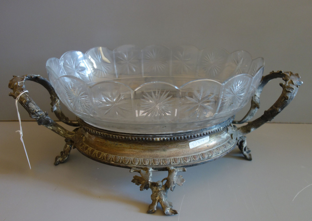 Centrotavola in metallo argentato decorato con tralci di uva, coppa in cristallo molato