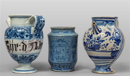 (h.cm.19 e 15) e un albarello in ceramica di Bassano sec.XVIII (h.cm.19)