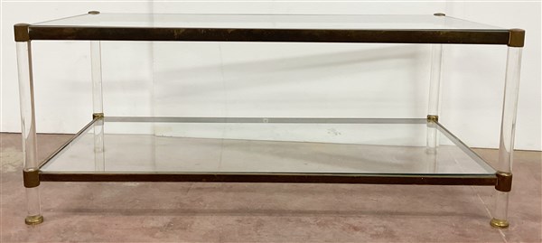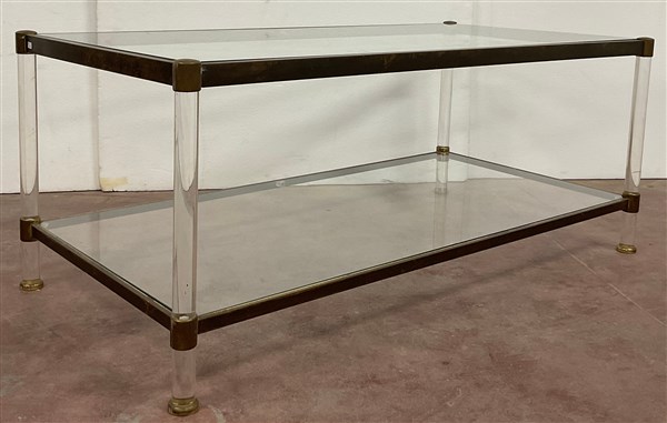 Tavolino da salotto con struttura in ottone e gambe in plexiglass, due ripiani