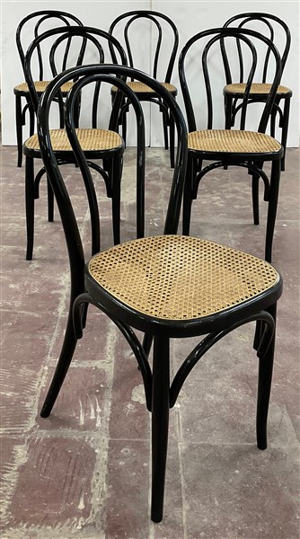 Sei sedie in legno curvato al vapore e dipinto di nero con seduta in paglia di Vienna. Secolo XX. (cm 39x87x46) (difetti)