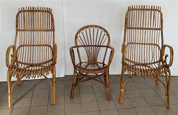 Lotto composto da una coppia di poltrone ed una poltroncina in vimini. Italia, secolo XX. (cm 55,5x108x74; cm 54x84x56) (difetti)