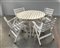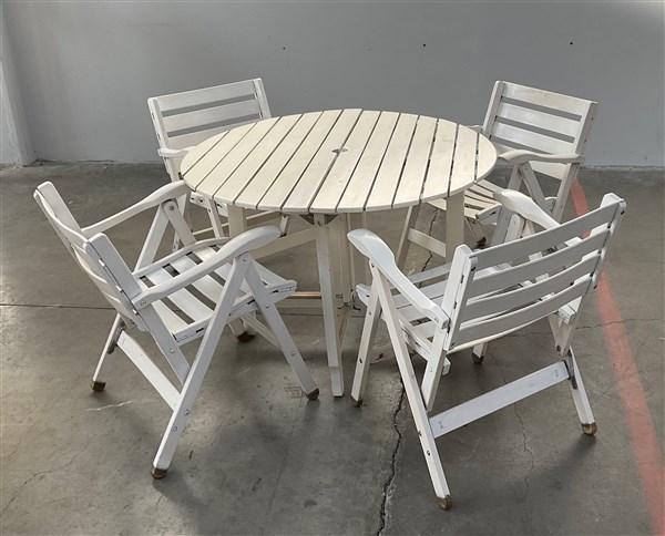 Fornitura da giardino in legno verniciato bianco composta da un tavolo tondo (d cm 102; h cm 70) e quattro poltroncine (cm 57x74x53). Italia, seconda metà secolo XX. Marcate. (difetti)